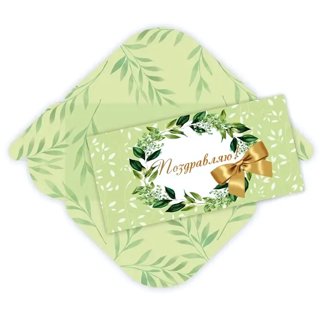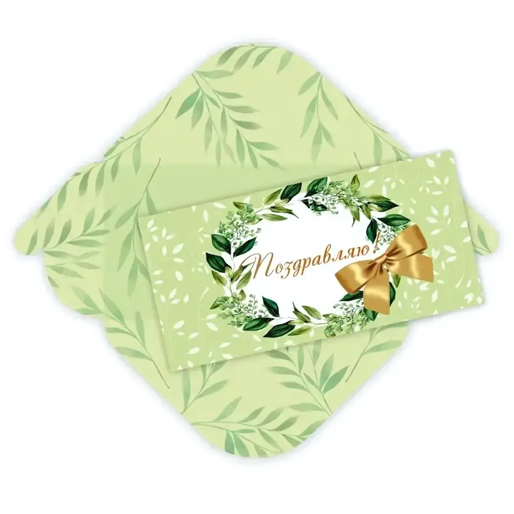Элегантный дизайн с нежно-зеленым фоном и золотым бантом подходит для любого случая. Качественная бумага обеспечивает долговечность, а продуманный размер позволяет удобно разместить купюры любого номинала.