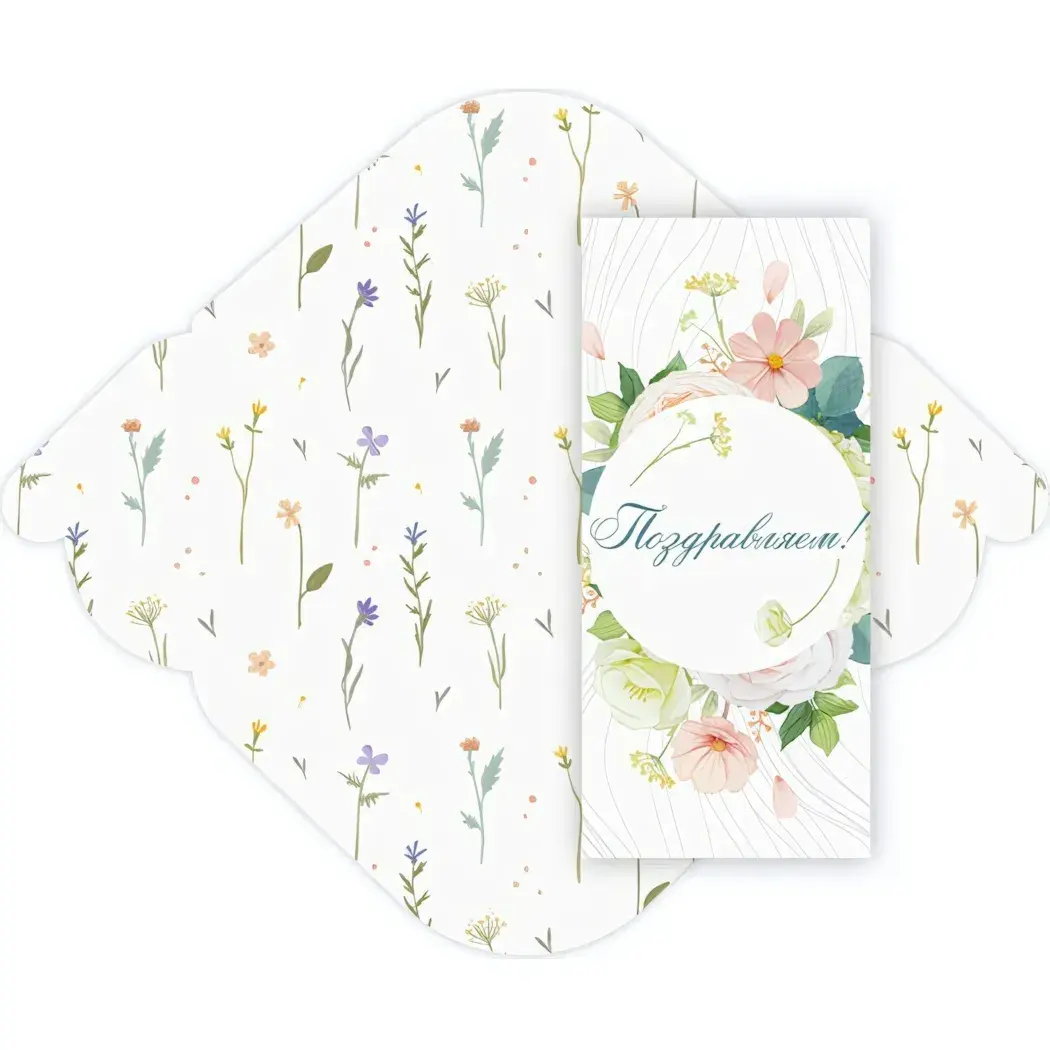 Подарите радость и тепло своим близким с помощью конверта для денег стандарт «Поздравляем - Цветочки». Этот стильный и элегантный конверт станет идеальным дополнением к любому подарку, создавая атмосферу праздника и радости. Нежные пастельные оттенки и цветочный узор на белом фоне делают его универсальным для любого торжества.