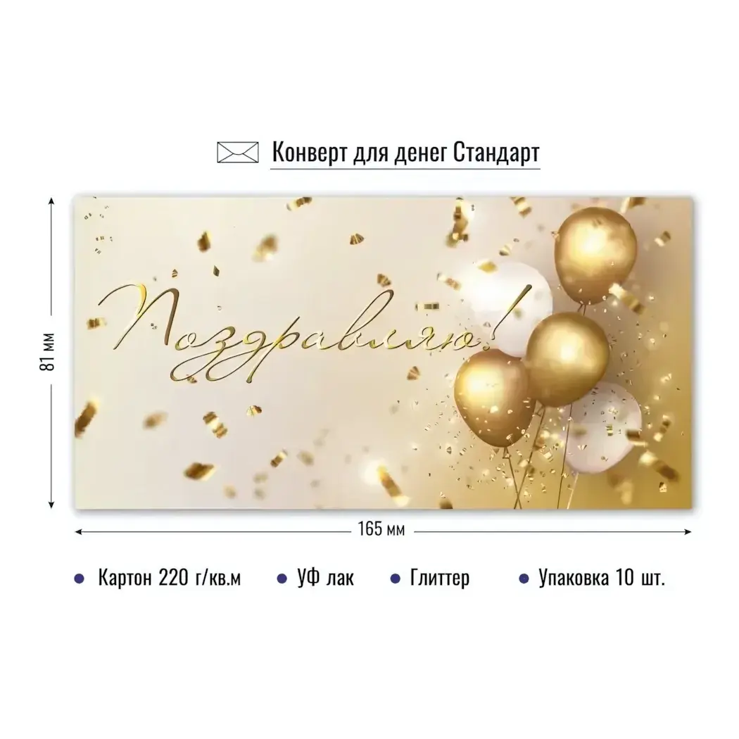 Конверт предназначен для хранения денежных средств и подарочных карт. Он идеально подходит для различных торжеств: дней рождения, свадеб, юбилеев и других значимых событий. Размер конверта 165 мм в ширину и 81 мм в высоту позволяет удобно разместить в нем купюры и открытки.