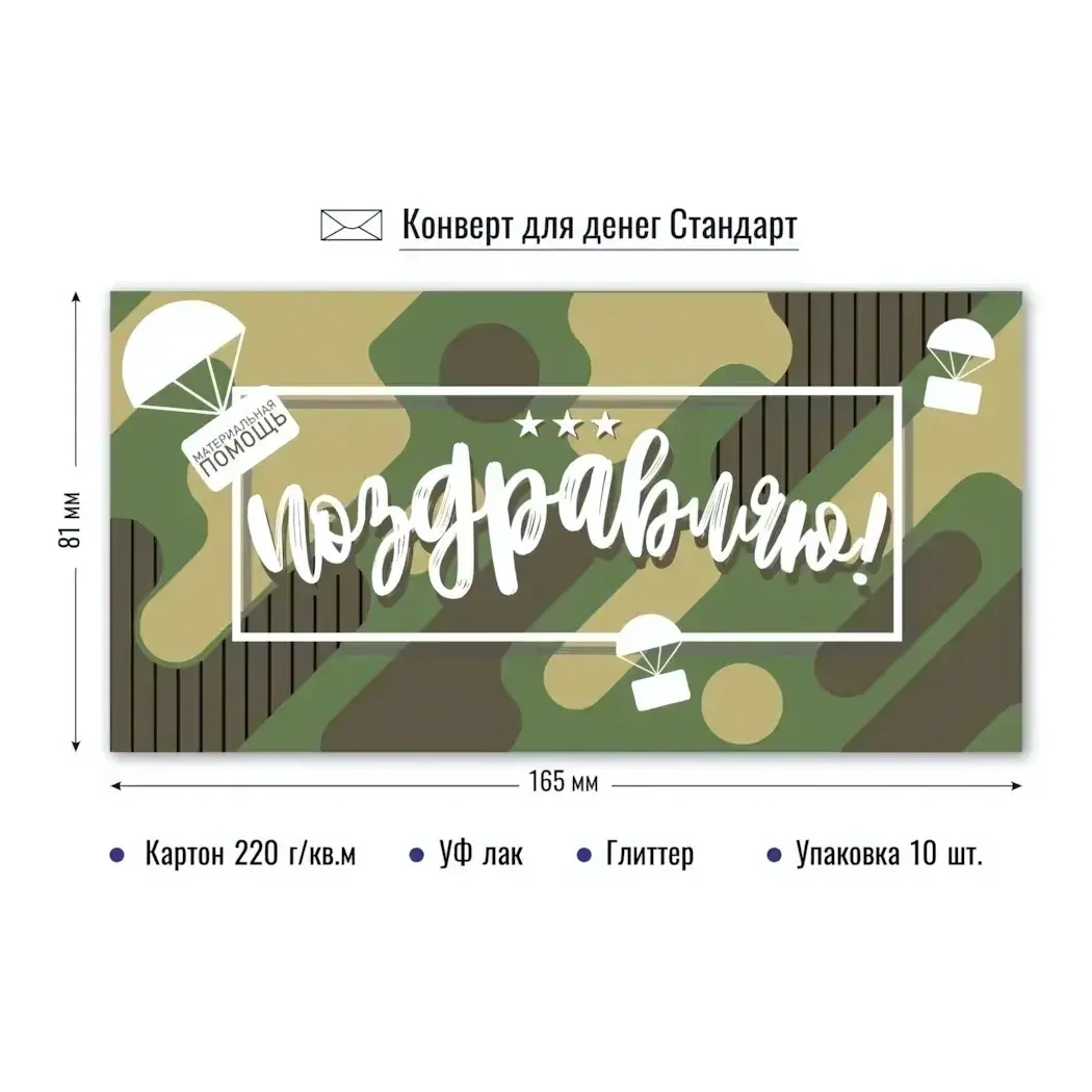 Сделайте момент вручения денег запоминающимся с оригинальным конвертом в стиле камуфляжа. Его уникальный дизайн и качественное исполнение подчеркнут важность вашего подарка.