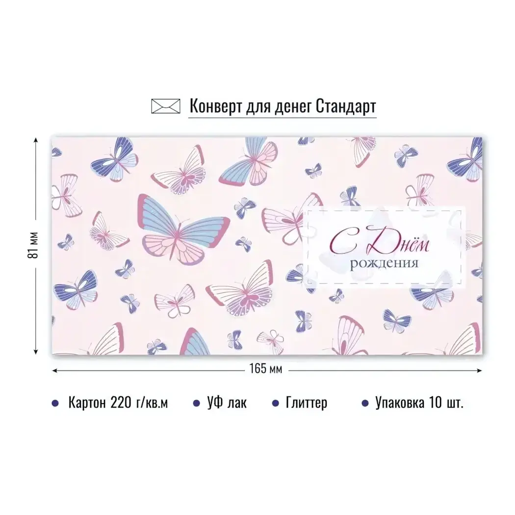 Подарите радость и тепло своим близким с помощью нашего конверта для денег стандарт с днем рождения «Бабочки». Этот стильный и яркий конверт станет отличным дополнением к любому подарку, добавляя нотку праздника и уюта. Его привлекательный дизайн с бабочками на розовом фоне не оставит равнодушным ни одного именинника.