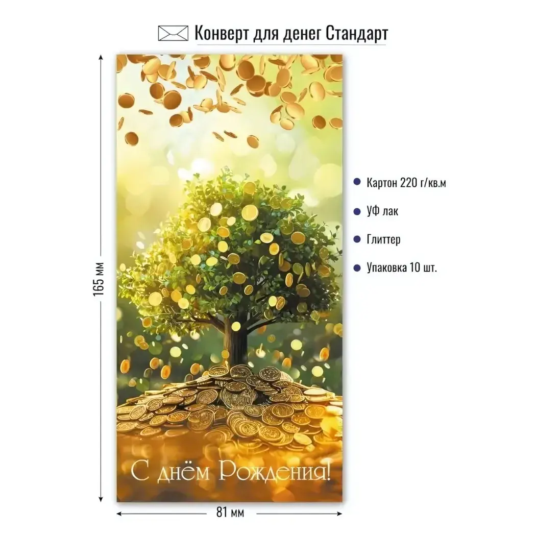 Подарите не просто деньги, а настоящее настроение праздника. Конверт для денег "Денежное дерево" превратит ваш презент в особенный сюрприз благодаря яркому дизайну и эффекту блестящих монет.