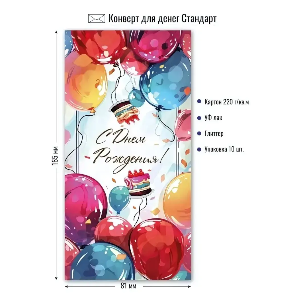 Праздничный конверт 'Море шаров' создан для тех, кто ценит внимание к деталям. Яркий дизайн с воздушными шарами и десертами поднимет настроение получателю еще до открытия конверта.