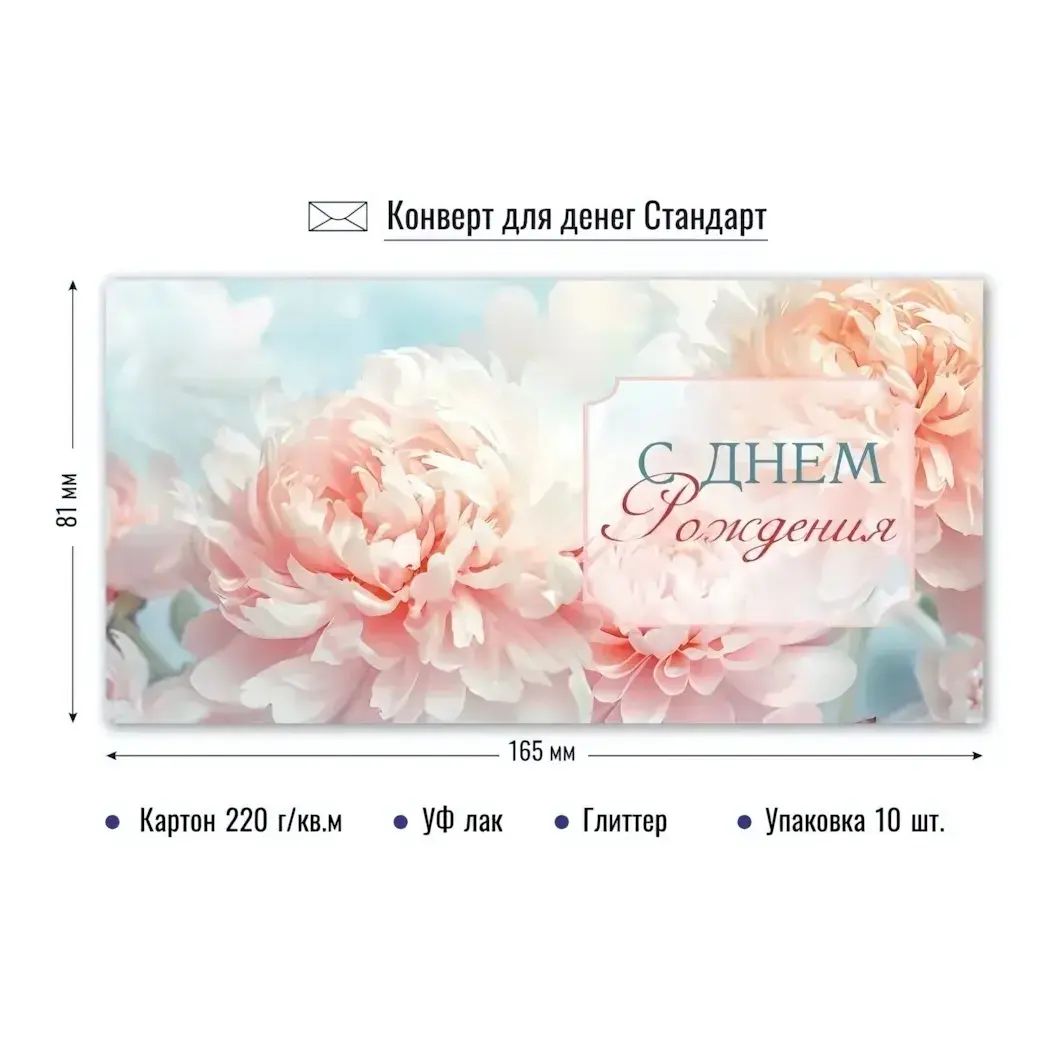 Конверт для денег «Нежные пионы» создан, чтобы сделать ваш подарок особенным. Нежный дизайн с изящными пионами и праздничное оформление создают идеальное настроение для поздравления.