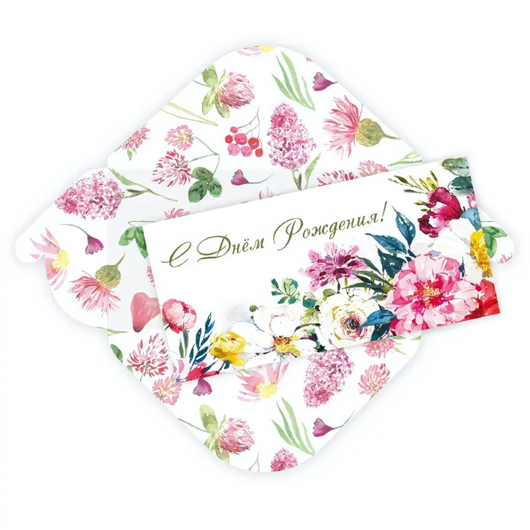 Выбирая наш конверт, вы получаете не только красивую упаковку, но и высокое качество. Изготовленный из бумаги с мелованной поверхностью, он отличается прочностью и долговечностью. Яркие цветы на конверте, выполненные в различных оттенках розового, желтого и белого, создают праздничное настроение и подчеркивают важность момента. Золотистый шрифт на открытке с надписью «С Днём Рождения!» добавляет элегантности и стиля.