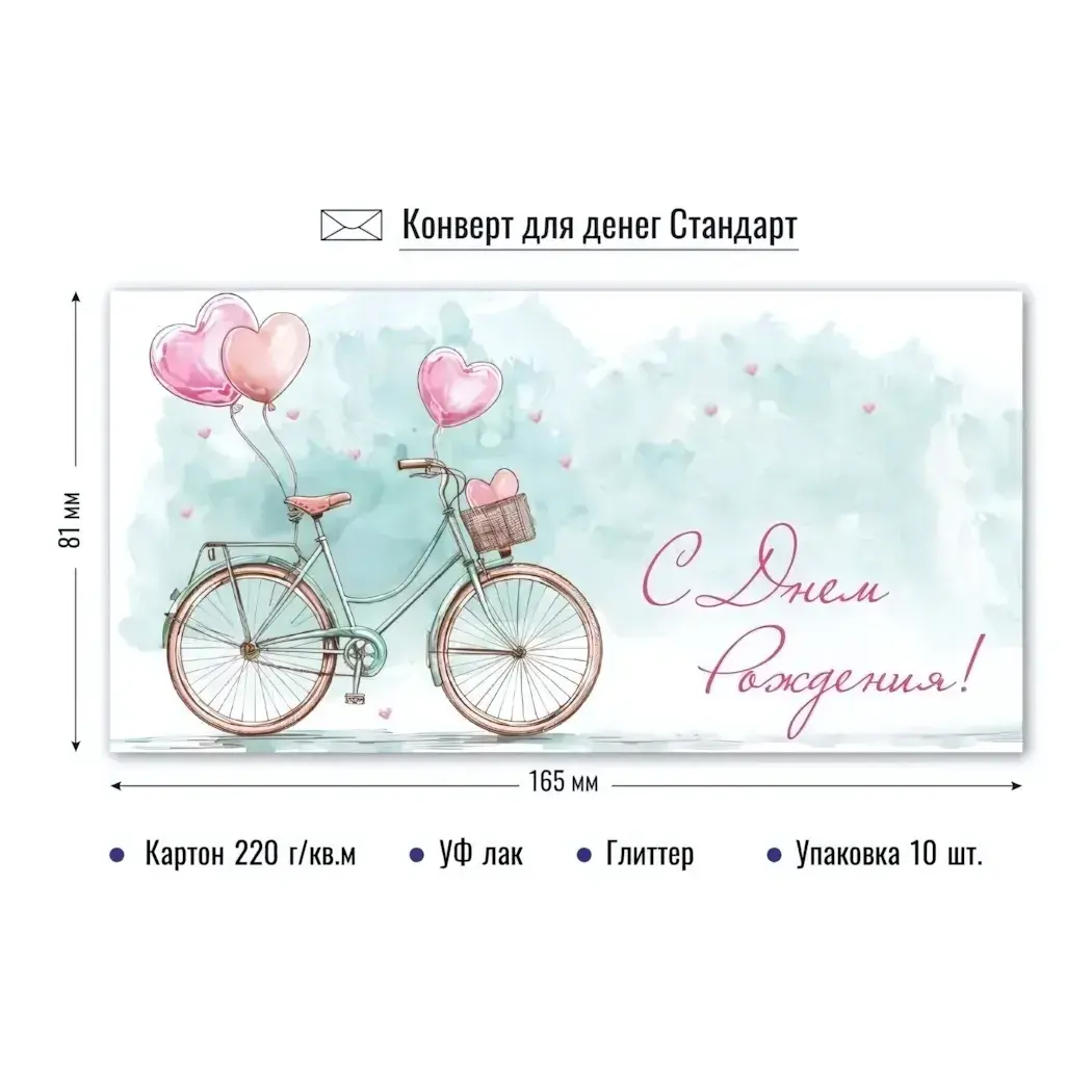 Подарочный конверт с оригинальным дизайном превратит денежный подарок в трогательное поздравление. Акварельный велосипед с воздушными шарами и глиттерным декором создает атмосферу настоящего торжества.