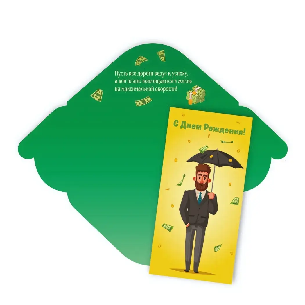 Этот стильный конверт для денег станет идеальным дополнением к любому подарку на день рождения. Яркий зелёный цвет и оригинальный дизайн с изображением человека в деловом костюме на фоне падающих долларов создают атмосферу праздника и успеха. Поздравьте своих близких с этим уникальным конвертом, который не только подчеркнёт ваше внимание, но и добавит нотку веселья в торжество.