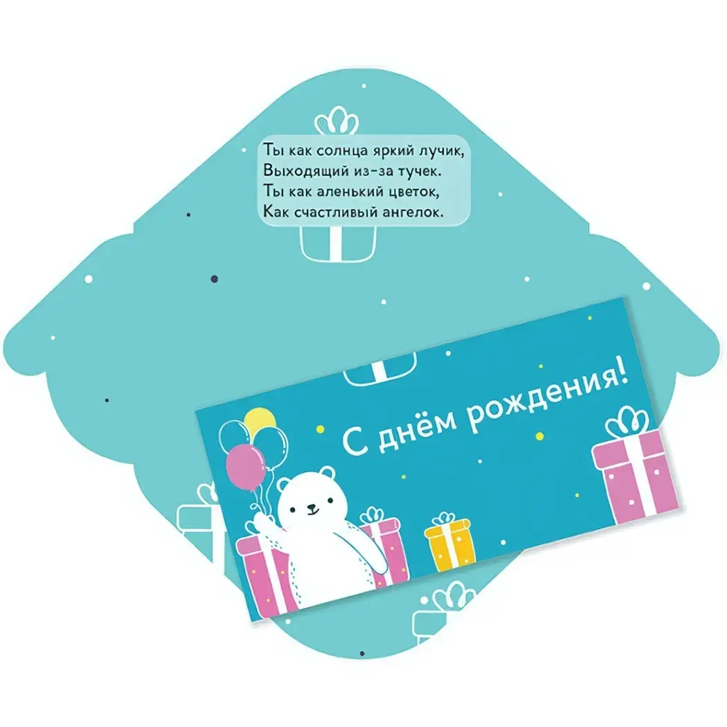 Конверт выполнен в голубом цвете с белыми деталями и украшен изображением белого медвежонка с воздушными шарами. На лицевой стороне крупным шрифтом написано «С днём рождения!», а также присутствует стихотворная надпись, которая добавляет индивидуальности. Размер конверта стандартный, что позволяет удобно помещать в него деньги или подарочные карты.