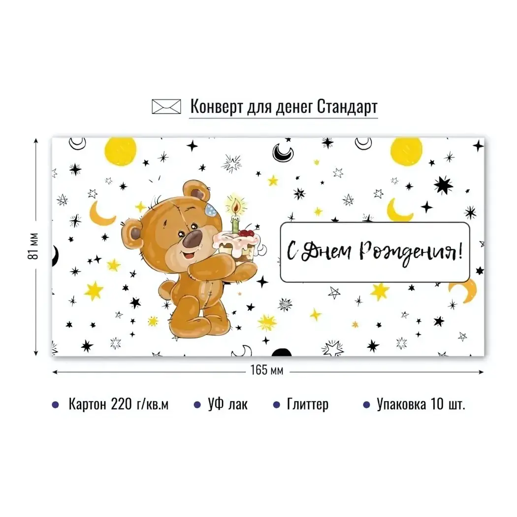 Почему стоит выбрать именно этот конверт? Во-первых, он изготовлен из качественной бумаги плотностью 220 г/кв.м, что обеспечивает его долговечность и надежность. Во-вторых, на конверте изображён милый медвежонок с праздничным тортом, который обязательно привлечёт внимание и создаст праздничное настроение. Текст «С Днем Рождения!» оформлен в прямоугольной рамке, что добавляет стильности и завершенности дизайну.
