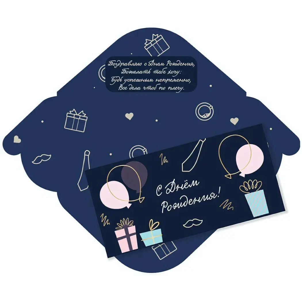 Подарите радость и тепло своим близким с помощью нашего конверта для денег стандарт «С Днём Рождения». Этот стильный и яркий конверт станет отличным дополнением к любому подарку, создавая атмосферу праздника и веселья. Его тёмно-синий цвет и праздничные графические элементы, такие как подарки и воздушные шары, привлекут внимание и поднимут настроение.