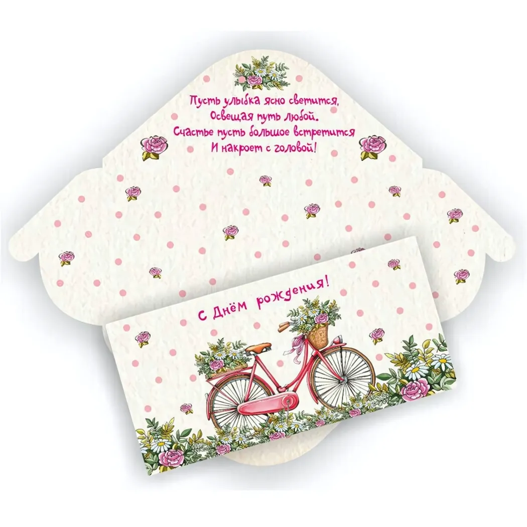 Подарите радость и улыбки с нашим конвертом для денег, оформленным в ярком и праздничном стиле. Этот конверт станет идеальным дополнением к любому подарку на день рождения, создавая атмосферу праздника и веселья. Яркие цвета и оригинальный дизайн с изображением велосипеда и цветами привлекут внимание и поднимут настроение.