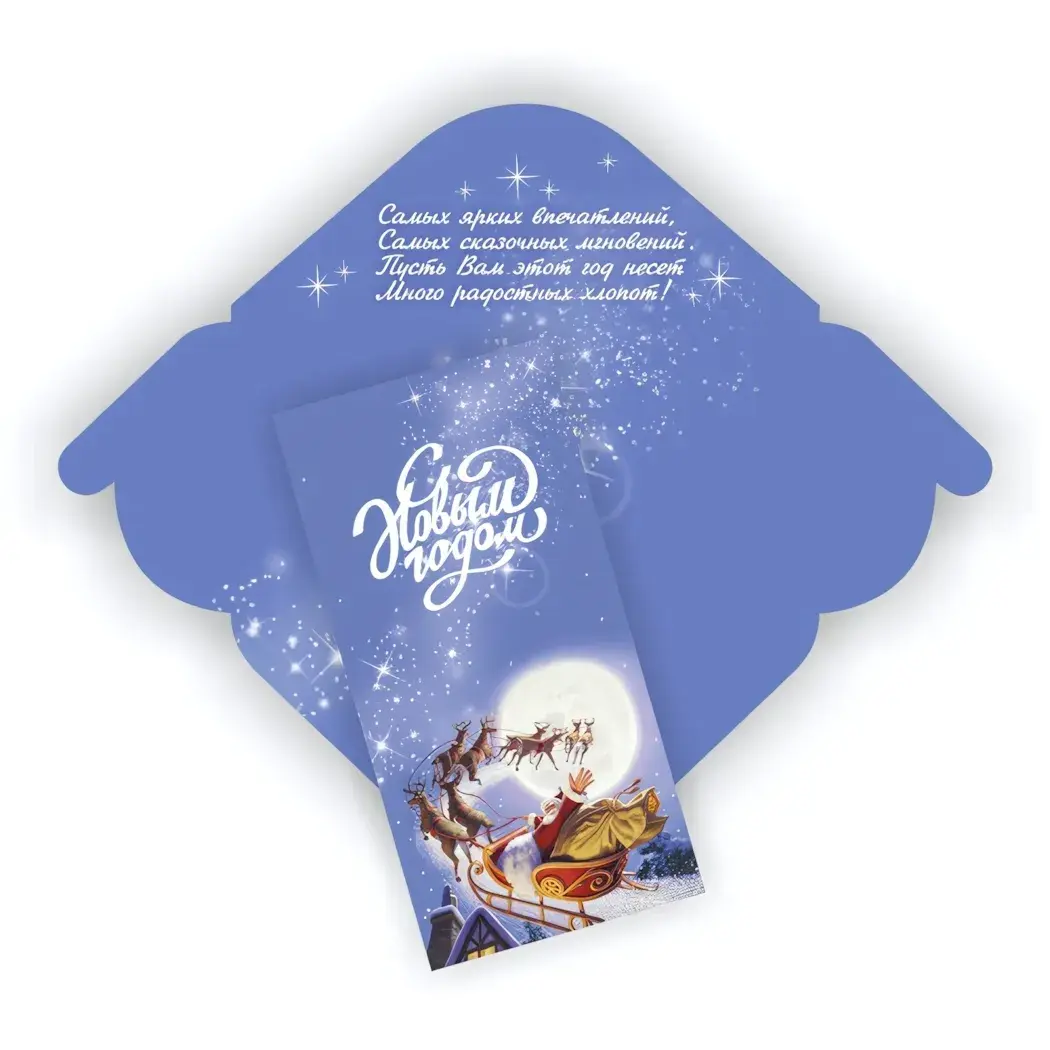 Внутри — открытка с тематическими пожеланиями, дополняющая ваш подарок теплыми словами. Конверт удобно использовать для денежных подарков, сертификатов, билетов — все, что вы хотите преподнести близким на Новый год.
