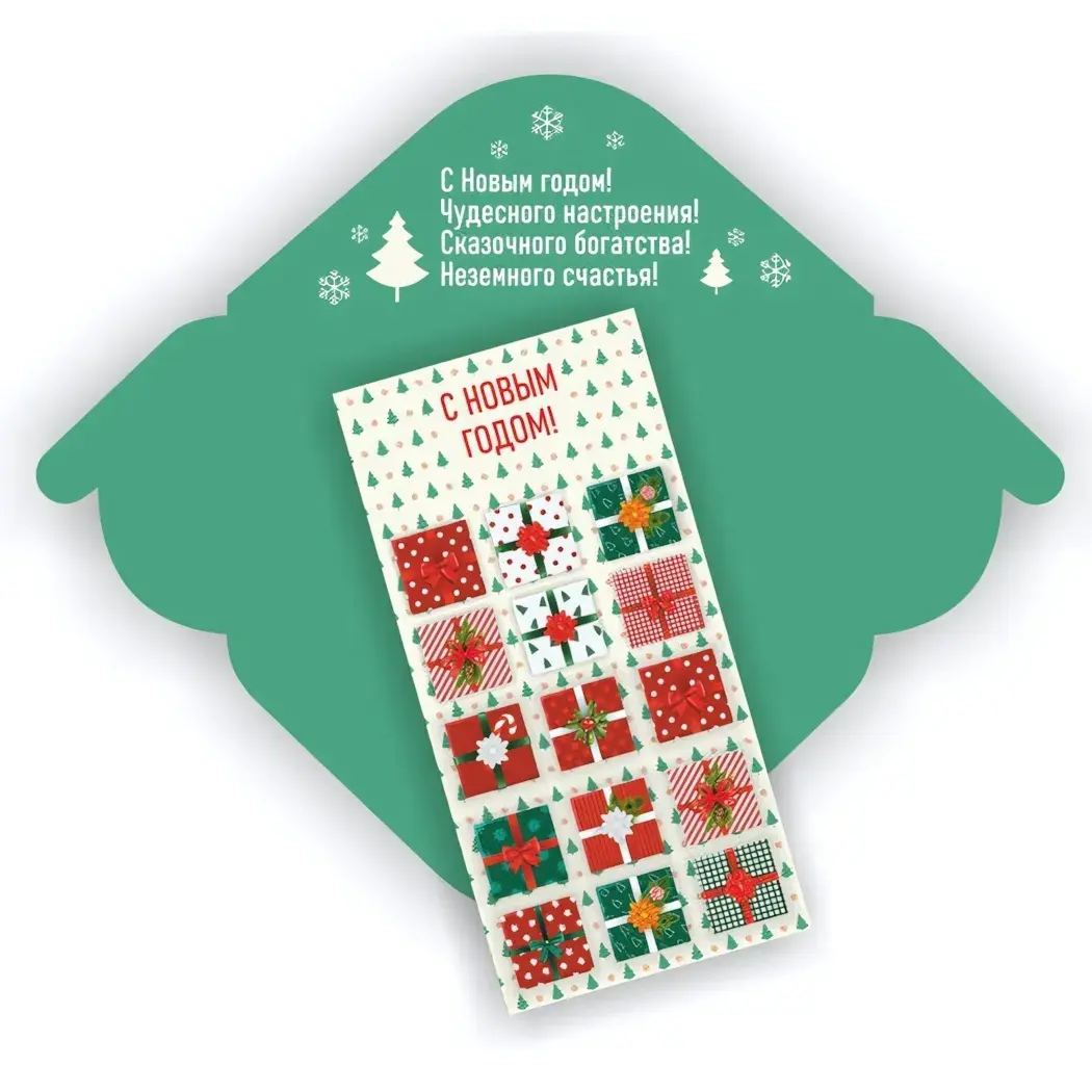 Конверт выполнен из качественной бумаги, что обеспечивает его долговечность и презентабельный вид. Зеленый фон с изображениями подарков и новогодними символами создает праздничное настроение. Размеры конверта стандартные, что позволяет удобно помещать в него деньги или подарочные карты. Не упустите возможность сделать ваш подарок еще более особенным с помощью этого замечательного конверта!
