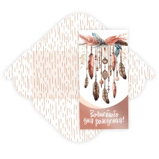 - Тематический дизайн: Утонченное изображение ловца снов с перьями, бусинами и декоративными подвесками в коричневых, бежевых и нежно-розовых тонах создает атмосферу волшебства и исполнения желаний, идеально соответствующую празднику.