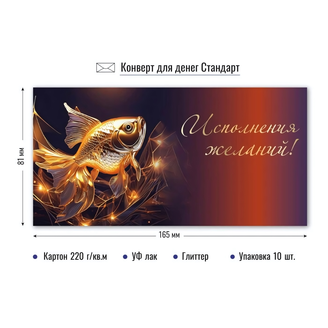 Поиск идеального способа вручить денежный подарок заканчивается здесь. Конверт для денег из серии «Золотая рыбка» — это сочетание изысканного стиля и высокого качества полиграфии. Яркое оформление с использованием золотистой рыбки на фоне насыщенного градиента от темно-синего до огненно-рыжего цвета превращает обычный жест внимания в настоящий праздник. Надпись «Исполнения желаний!», нанесенная аккуратным курсивом, добавляет подарку душевности и тепла.