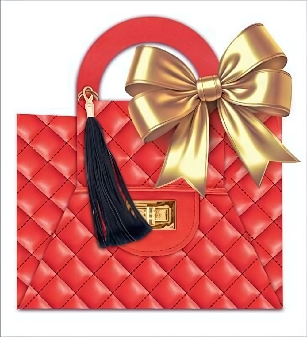 Подарочный конверт в виде стильной сумочки станет изысканным дополнением к денежному презенту. Ярко-красный цвет с глянцевым покрытием и ромбовидной текстурой создает эффект роскоши, а золотой бант с черной кисточкой добавляет торжественности.