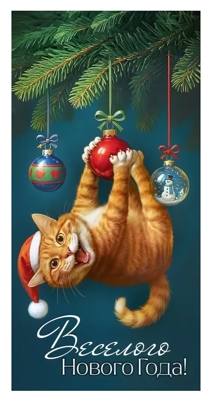 Подарите вашим близким не просто деньги, а праздничное настроение. Этот конверт создан специально для того, чтобы подчеркнуть значимость подарка и сделать момент вручения ярким и запоминающимся. На лицевой стороне изображён забавный оранжевый котёнок в новогодней шапочке, свисающий вниз головой за рождественскую игрушку — деталь, которая вызовет улыбку у любого получателя.