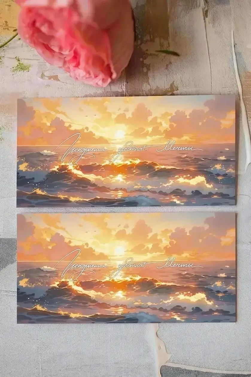 Выбирая конверт «Исполнения заветной мечты (закат)», вы получаете не просто упаковку, а произведение искусства. Его уникальный дизайн с изображением морского пейзажа и надписью «Последняя забота Мечты» добавляет особую нотку к любому подарку. Конверт изготовлен из качественной бумаги, что обеспечивает его долговечность и надежность.