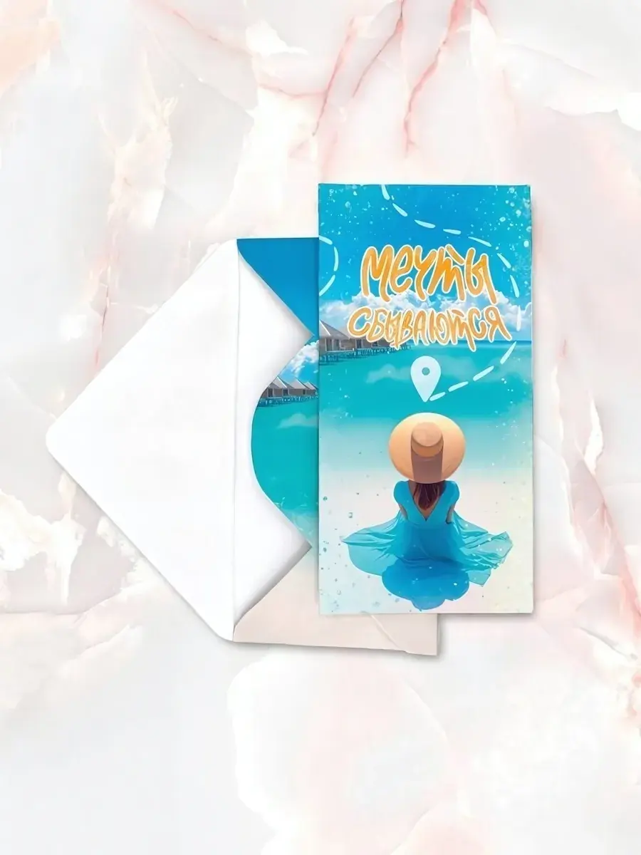 Конверт с открыткой «Мечты сбываются» создан для тех, кто ценит трогательные моменты и хочет подарить близким частицу вдохновения. Романтичный дизайн с изображением морского пейзажа и летящей фигуры в голубом платье перенесёт получателя в атмосферу безмятежности и надежды.