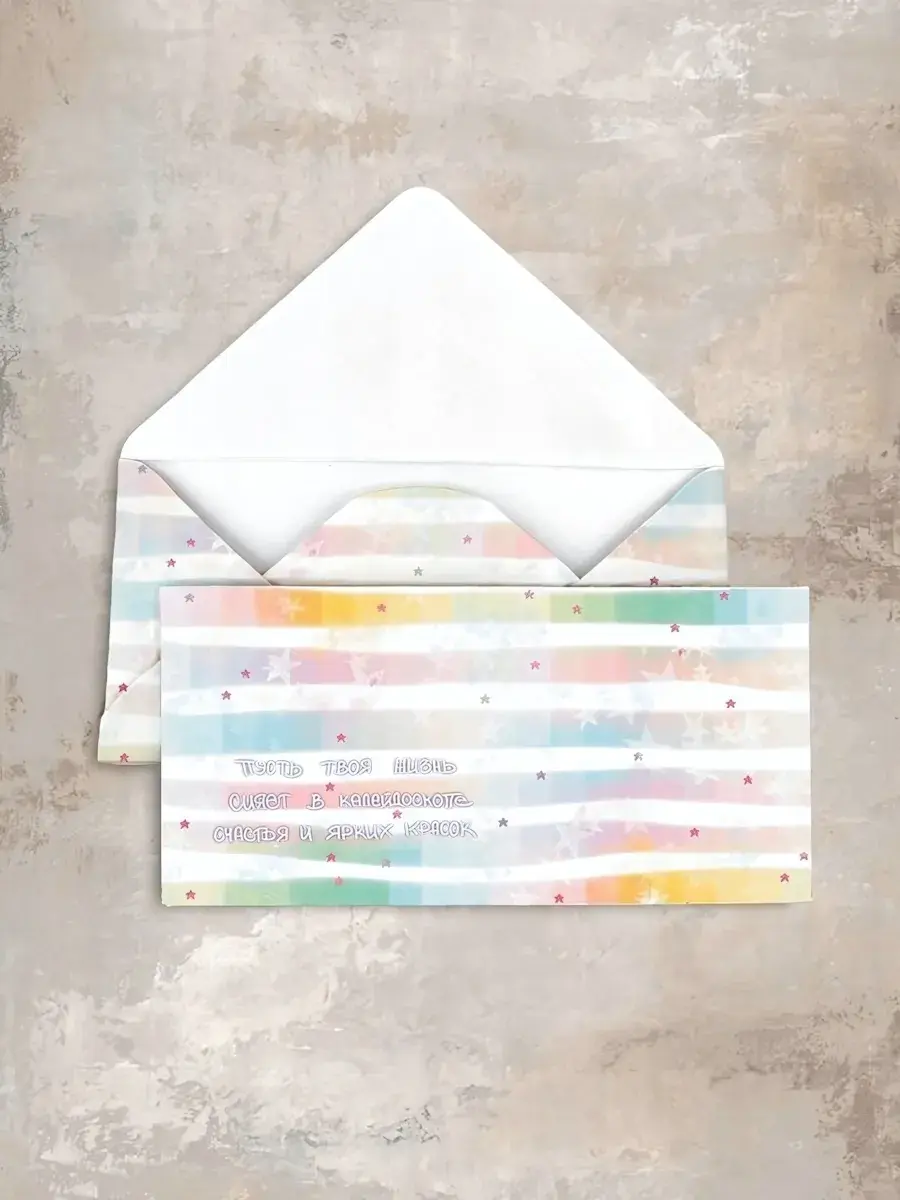 Этот конверт станет идеальным дополнением к любому подарку, добавляя яркие эмоции и радость в важные моменты вашей жизни. Его уникальный дизайн с многоцветными полосами и звездочками создает атмосферу праздника и счастья, что делает его отличным выбором для поздравлений и пожеланий.