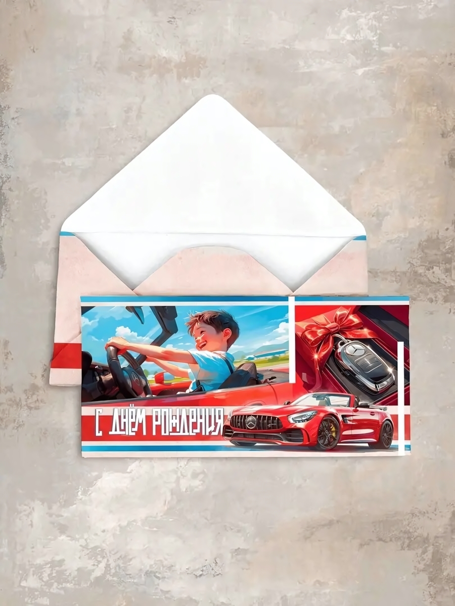Подарите поздравление в ярком и стильном конверте 'С Днем Рождения' Cn244. Его красочное оформление с изображением мальчика за рулем спортивного автомобиля создаст праздничное настроение уже при взгляде.