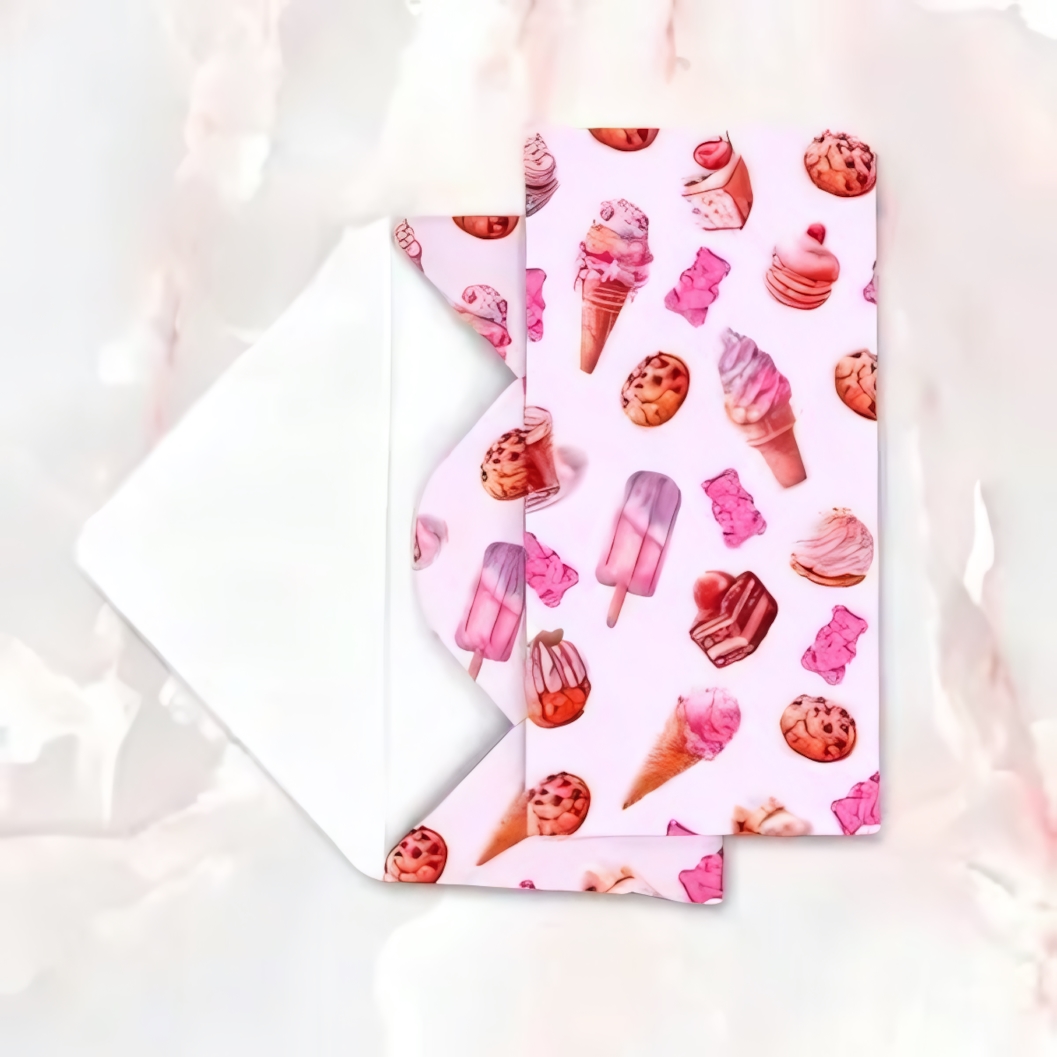 Главная изюминка этой модели — авторский разноцветный принт на внутренней стороне клапана и вкладыше. На нежно-розовом фоне гармонично расположены иллюстрации любимых лакомств: мороженое в вафельных рожках, печенье с кусочками шоколада, мармеладные мишки и праздничные кексы. Такая детализация делает конверт уникальным аксессуаром для ценителей эстетичной полиграфии.