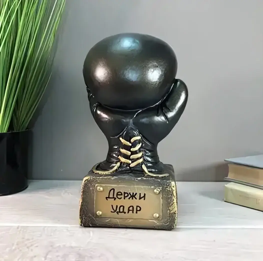 Размер копилки составляет 24 см, что делает ее компактной и удобной для размещения на столе или полке. Материал — гипс, который легко чистится и не требует особого ухода. Копилка имеет округлую форму верхней части, имитирующей пальцы боксерской перчатки, и основание, украшенное элементами, имитирующими шнуровку. На основании расположено золотистое название с надписью «ДЕРЖИ УДАР», что добавляет ей уникальности и стиля.