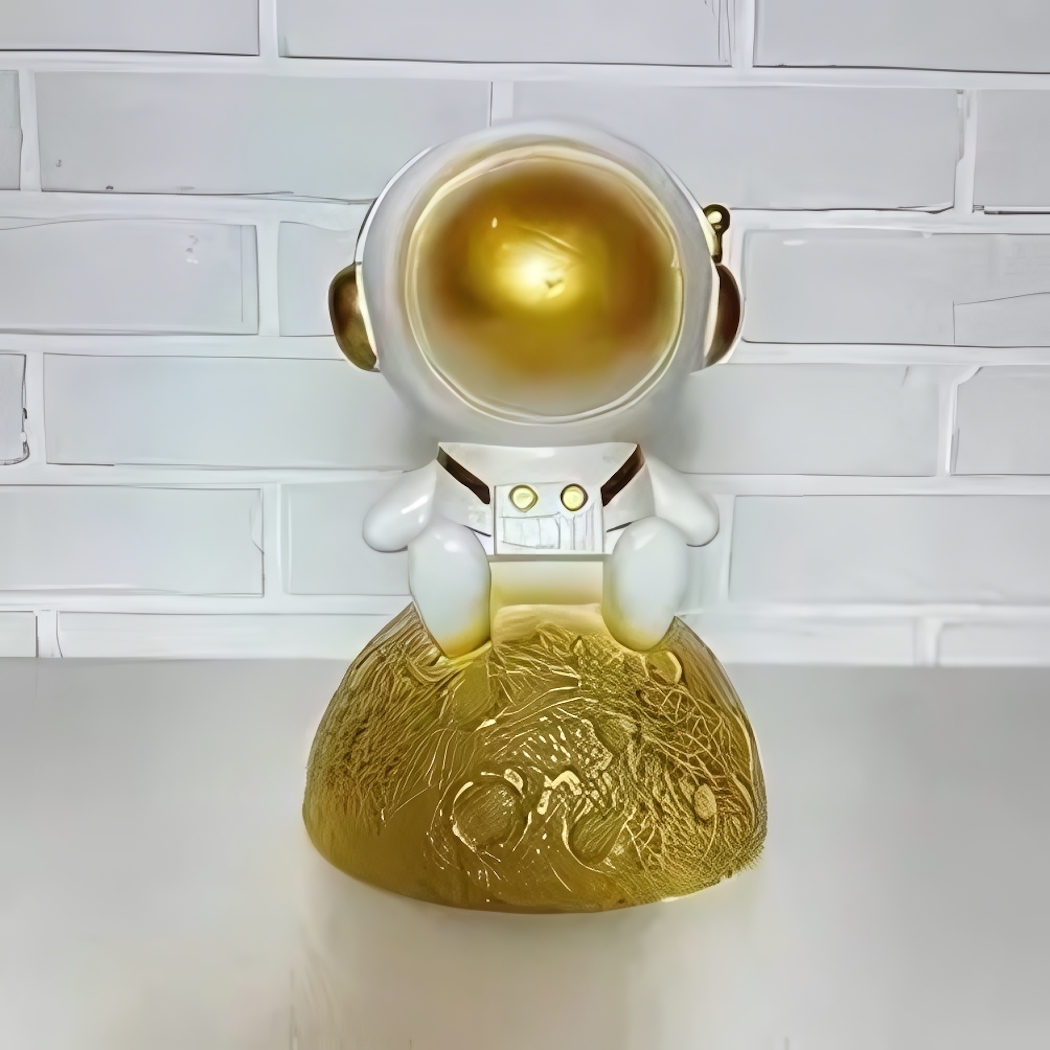 Фигурка космонавта выполнена в белом цвете с золотыми элементами: голова, детали шлема и поверхность, имитирующая лунный рельеф. Материал — гипс, что обеспечивает устойчивость формы и долговечность. Высота изделия 30 см позволяет разместить копилку даже в небольших пространствах, делая её выразительным акцентом интерьера.