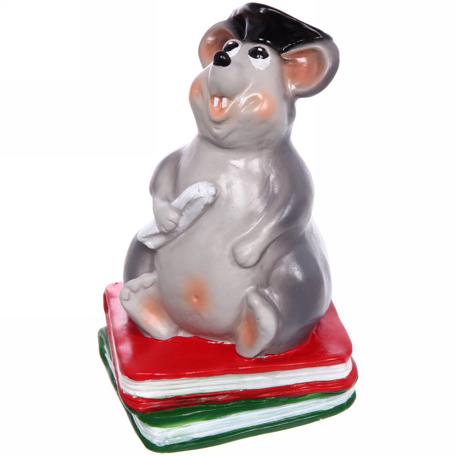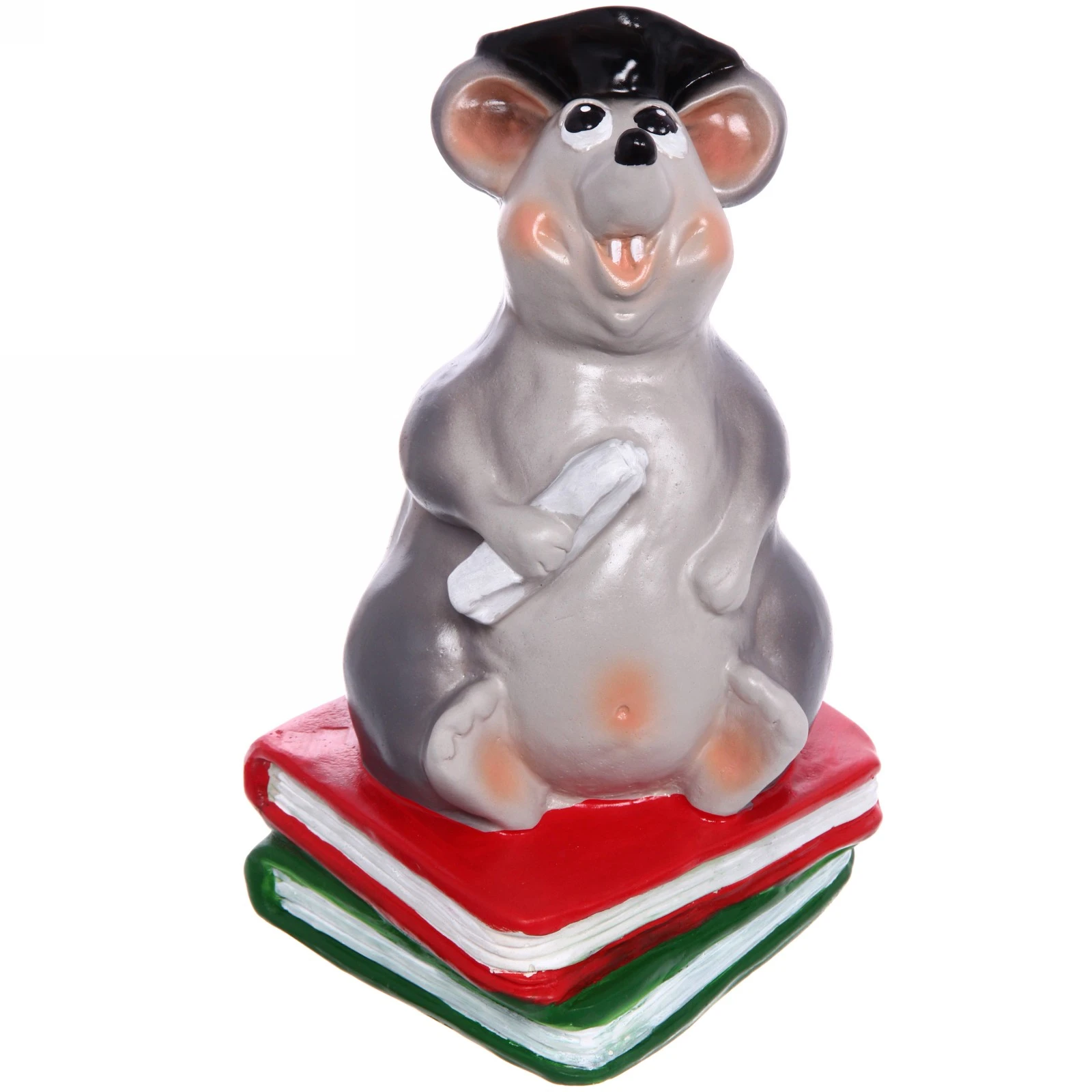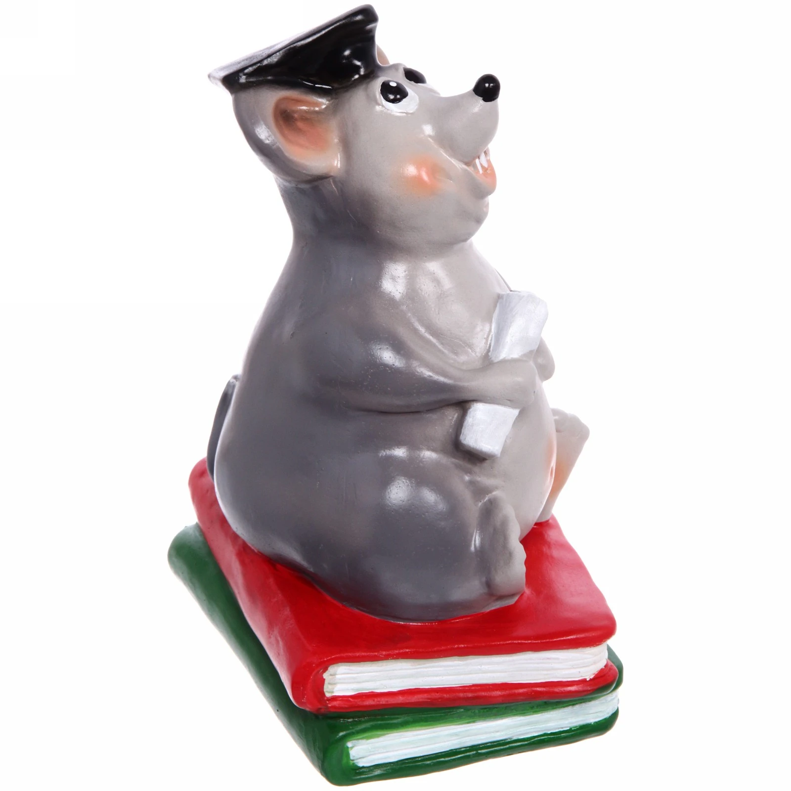 Фигурка выполнена из гипса и тщательно раскрашена вручную. Крыс одет в традиционную черную квадратную академическую шапочку и держит в лапке символическую монету (белый цилиндрический предмет), что подчеркивает его «ученый» статус и основную функцию — накопление. Он восседает на двух книгах — красной и зеленой, между которыми видны белые страницы. Большие выразительные глаза, розоватые ушки и забавные оранжевые зубы придают персонажу особый шарм и индивидуальность. Поверхность изделия гладкая, с глянцевым покрытием.