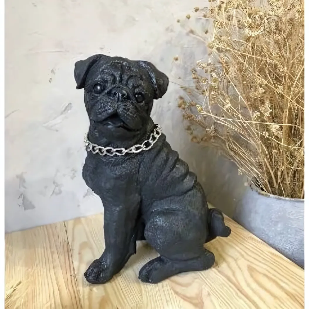 - Выразительный дизайн: Фигурка изображает сидящего мопса с характерной мордой и коротким хвостом. На шее собаки красуется декоративная металлическая цепь, добавляющая образу завершенность и стиль.