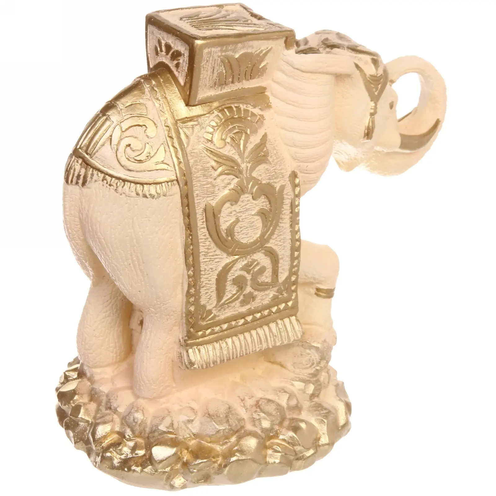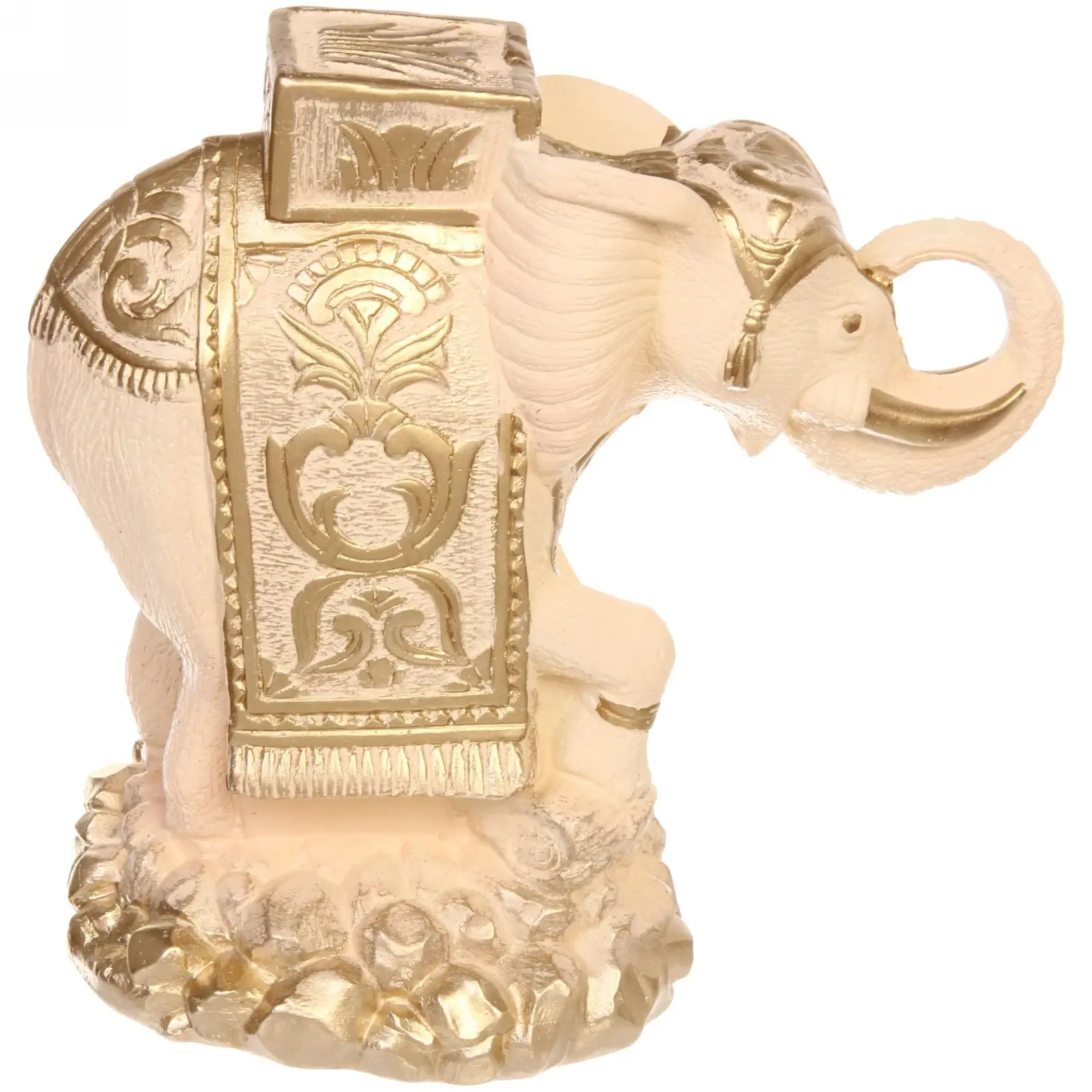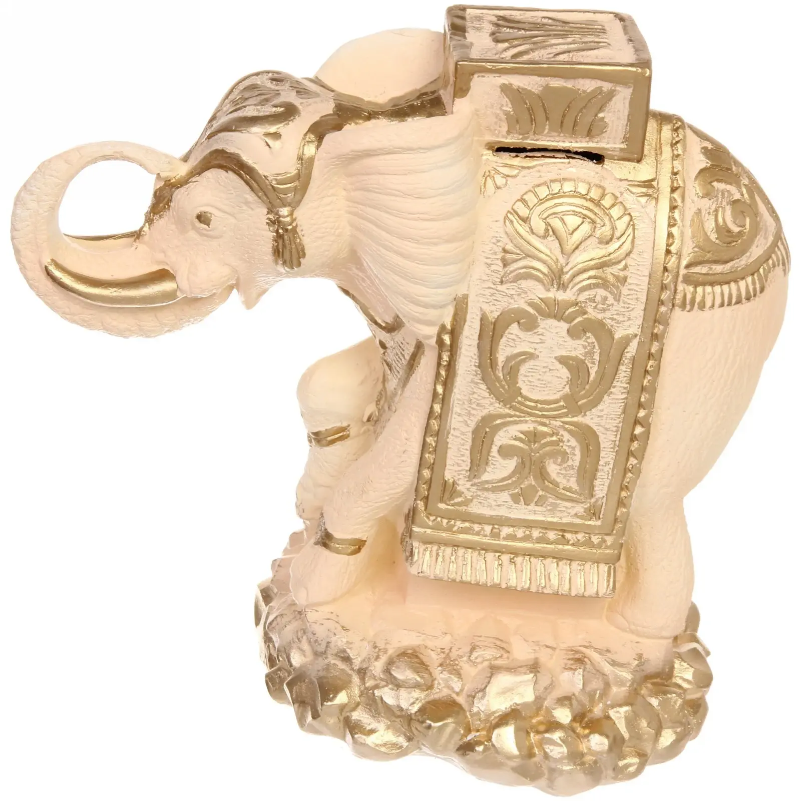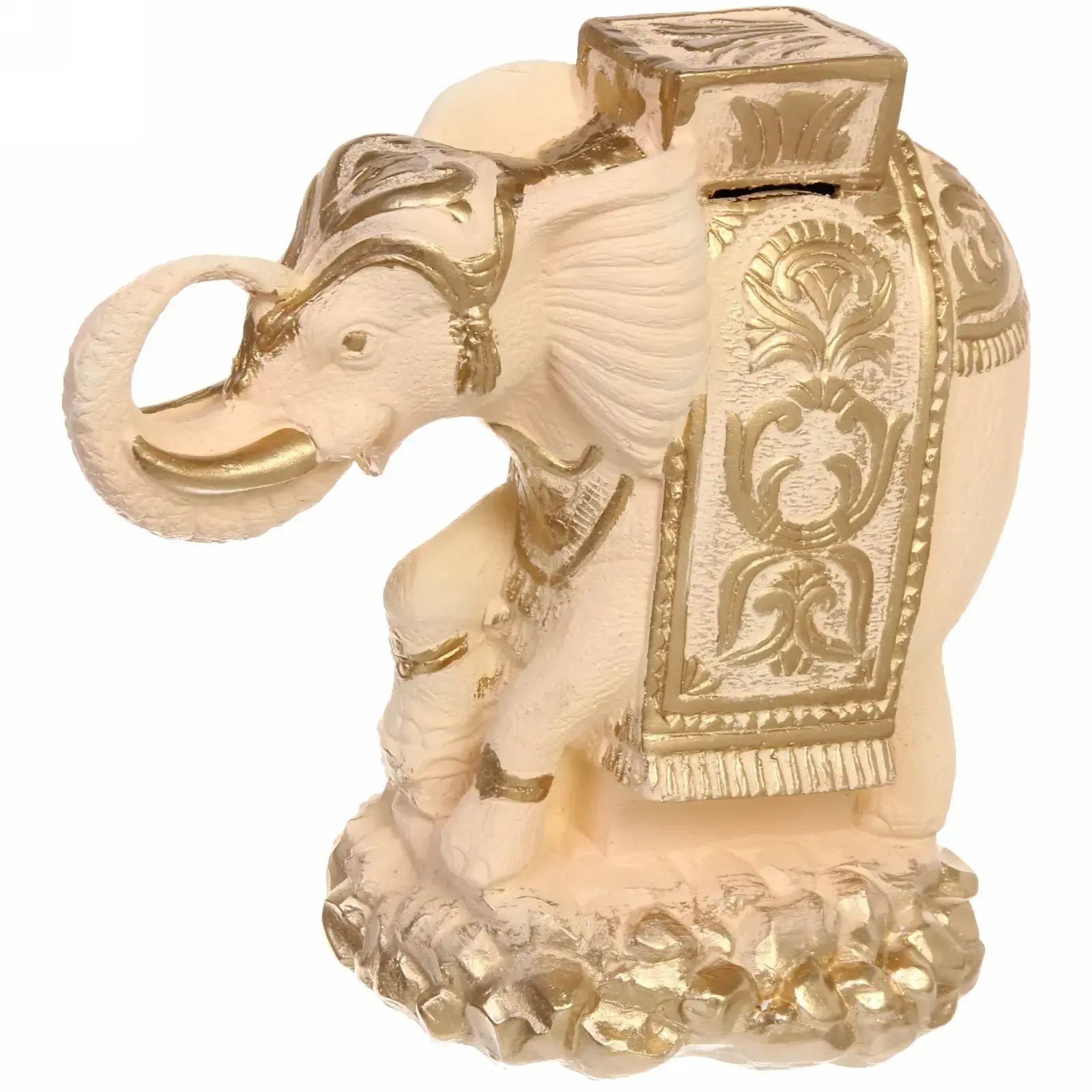 Эффектная копилка в форме слона выполнена из гипса с декоративными золотыми элементами. Она не только служит оригинальным украшением интерьера, но и помогает сохранять крупные деньги, поощряя финансовую грамотность.
