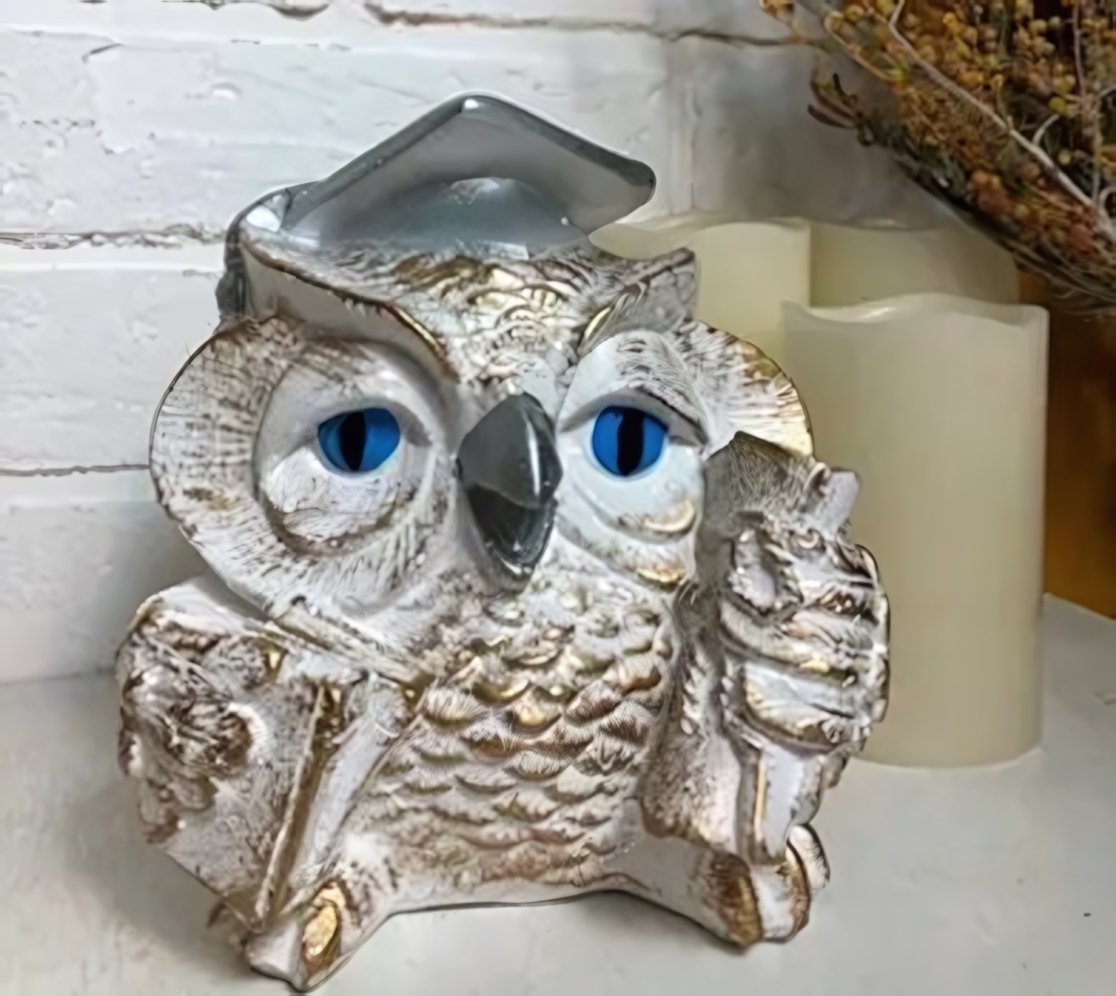 Каждая деталь копилки продумана и создана с любовью. Изделие выполнено из гипса, что обеспечивает его приятную матовую текстуру и солидный вес. Основной белый цвет гармонично сочетается с изящными золотистыми акцентами на крыльях, голове и лапах совы. Ярко-синие глаза и черный клюв добавляют образу выразительности. Особый шарм придают узнаваемые атрибуты: миниатюрная профессорская шапочка и книга в лапе, которые подчеркивают тему знаний и мудрости. Текстура поверхности имитирует перья, делая сову еще более реалистичной.