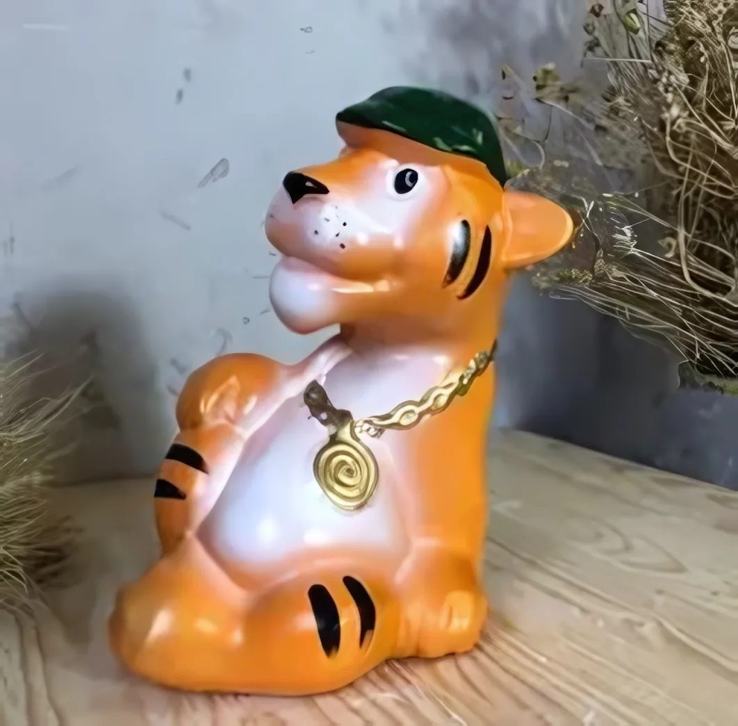 Эта яркая и харизматичная фигурка станет не просто местом для хранения мелочи, а настоящим талисманом, привлекающим финансовое благополучие и создающим особое настроение в интерьере. Стилизованный тигр в модной шапке и с цепочкой на шее — это запоминающийся подарок, который точно оценят по достоинству.