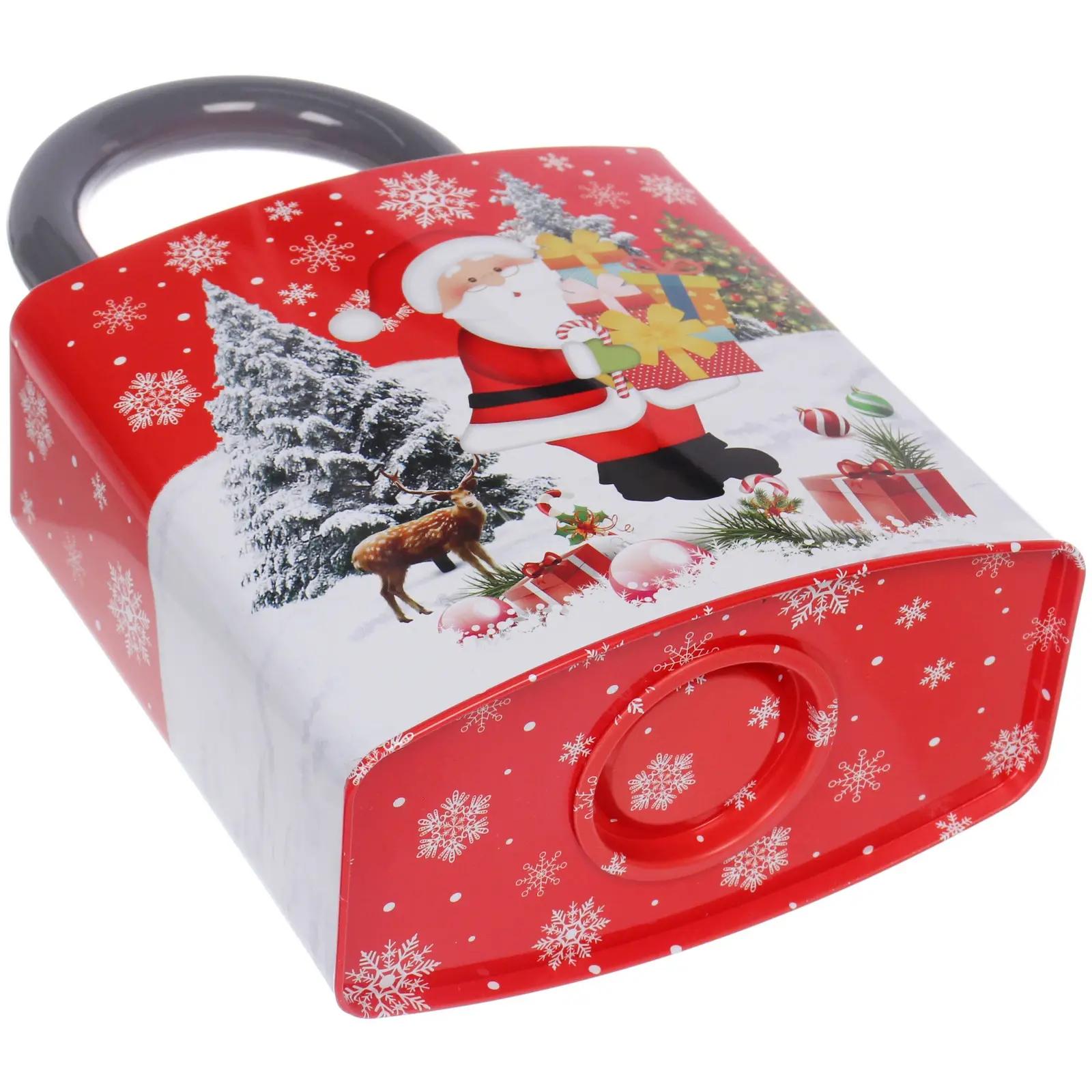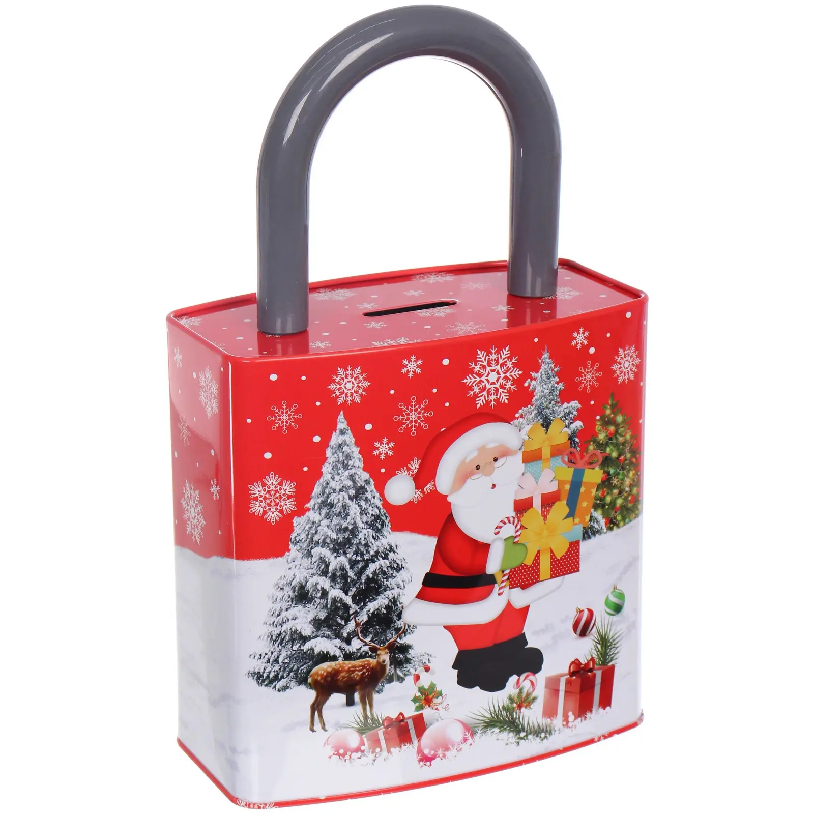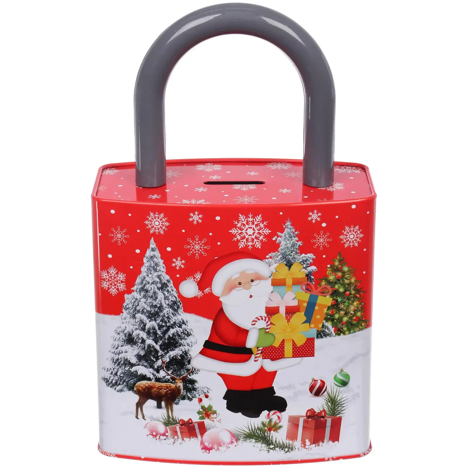 Копилка выполнена из качественной жести с глянцевым покрытием, которое сохранит яркость цветов долгое время. Дизайн включает классические новогодние элементы: Санта-Клауса, ёлки, оленя и подарки.