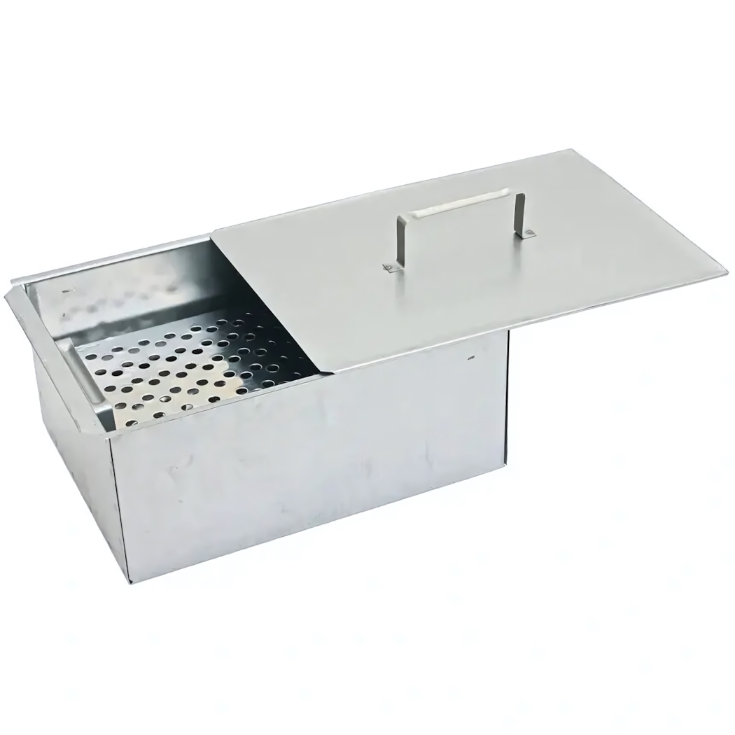 Конструкция включает корпус, поддон для сбора жира, две решетки и крышку с удобной ручкой. Достаточно уложить щепу из ольхи, яблони или вишни в корпус, установить поддон и решетки, накрыть крышкой — и через некоторое время вы получите аппетитные блюда с привлекательным золотистым оттенком и выразительным запахом копченостей.