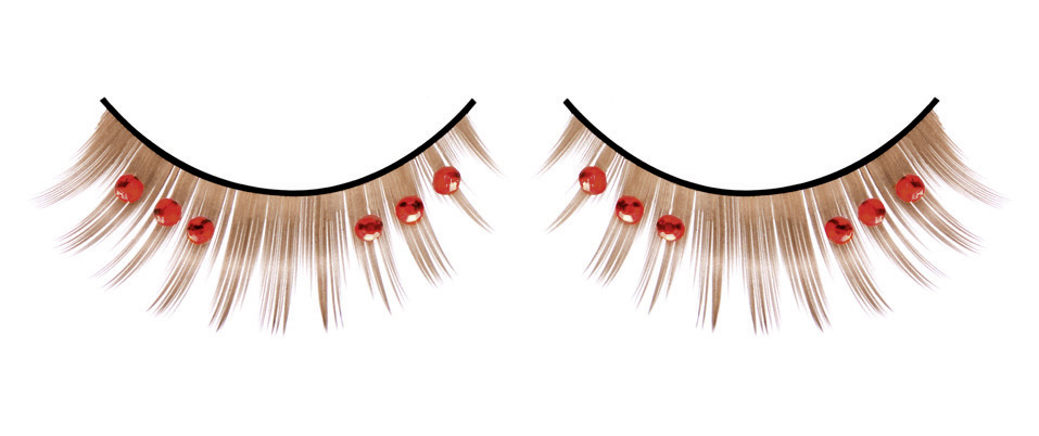 Ресницы выполнены из качественных материалов. Коричневый цвет волокон выглядит насыщенно, но при этом естественно, хорошо сочетаясь с различными оттенками теней и подводки. Красные декоративные элементы надёжно закреплены. Используйте прилагающийся клей для фиксации, следуя стандартной технике нанесения накладных ресниц. Помните, что данный товар предназначен для взрослых и относится к категории beauty-аксессуаров для создания особых, выразительных образов.