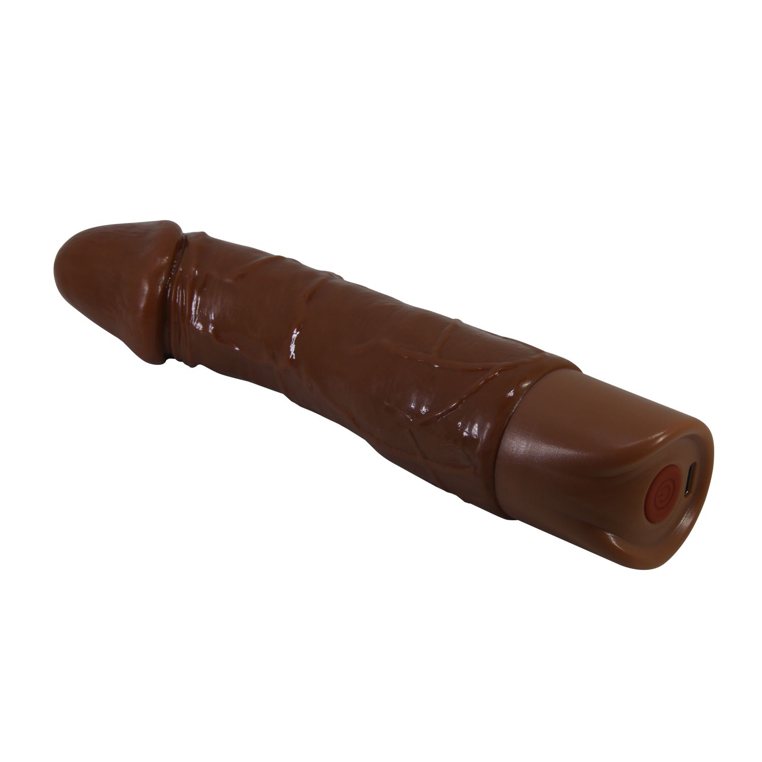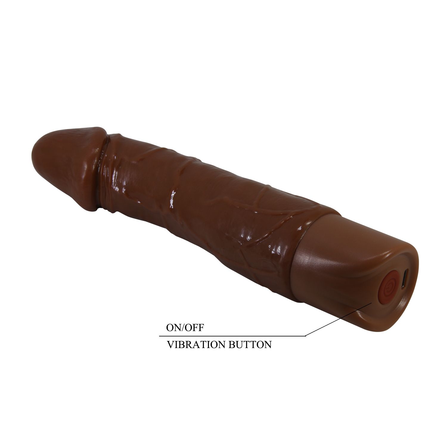 Длина изделия составляет 19.5 см, диаметр — 3.6 см. Коричневый цвет и классический дизайн придают модели естественный внешний вид. Основание матовое и удобно лежит в руке, обеспечивая уверенный контроль во время использования. Вибратор выполнен из термопластичного эластомера (tpe), материал приятен на ощупь и прост в уходе. Подходит для использования с лубрикантами на водной основе.