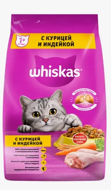 Хотите обеспечить свою кошку качественным и сбалансированным питанием? Корм Whiskas с курицей и индейкой - идеальное решение для ежедневного рациона взрослых кошек от 1 года.