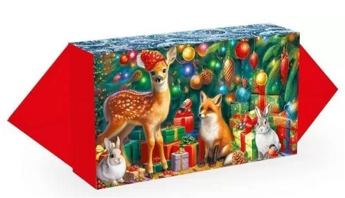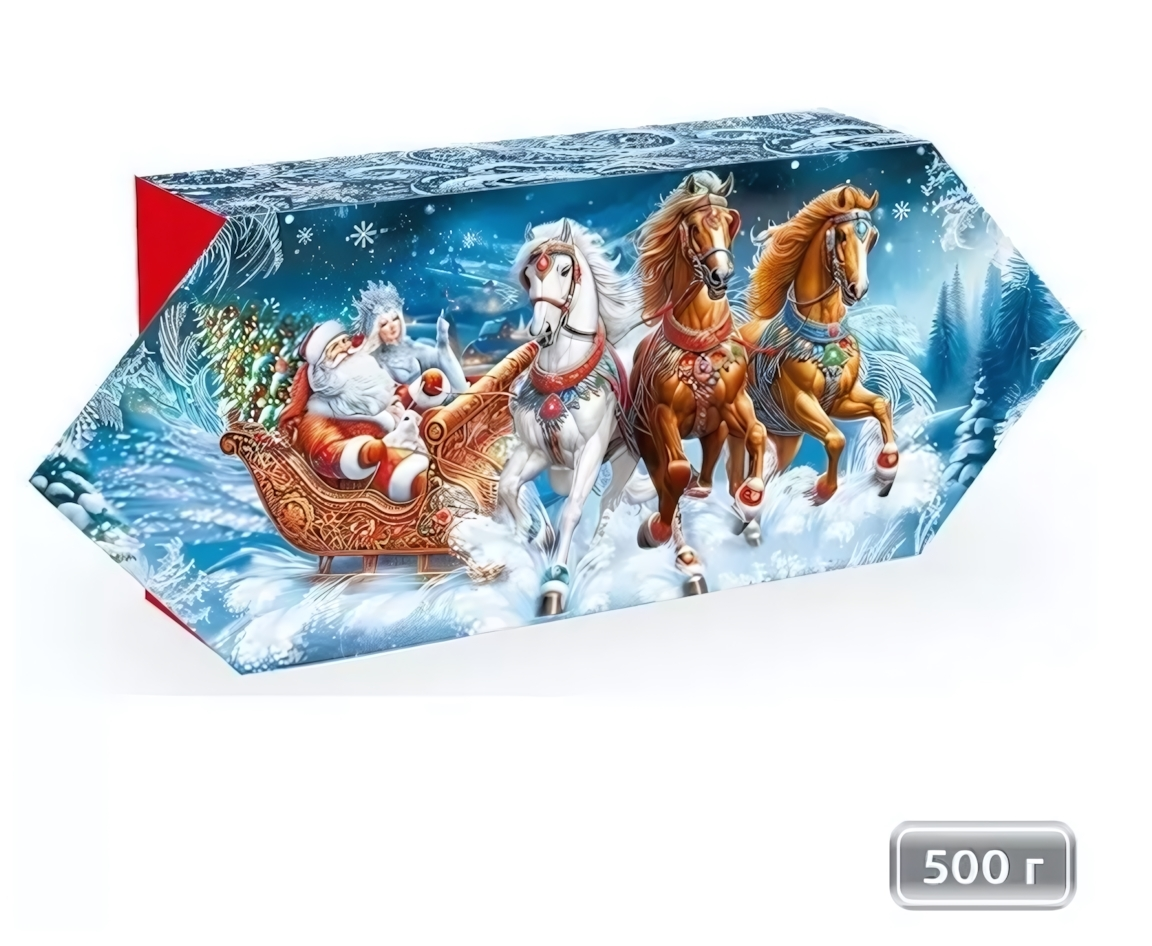 Яркий дизайн с изображением Деда Мороза и Снегурочки на тройке с зимними зверями создаст праздничное настроение на утренниках в детских садах и в школах, а также станет оригинальным способом поздравить коллег и близких. Коробка прекрасно подходит для корпоративных подарков или сладких угощений для родных.