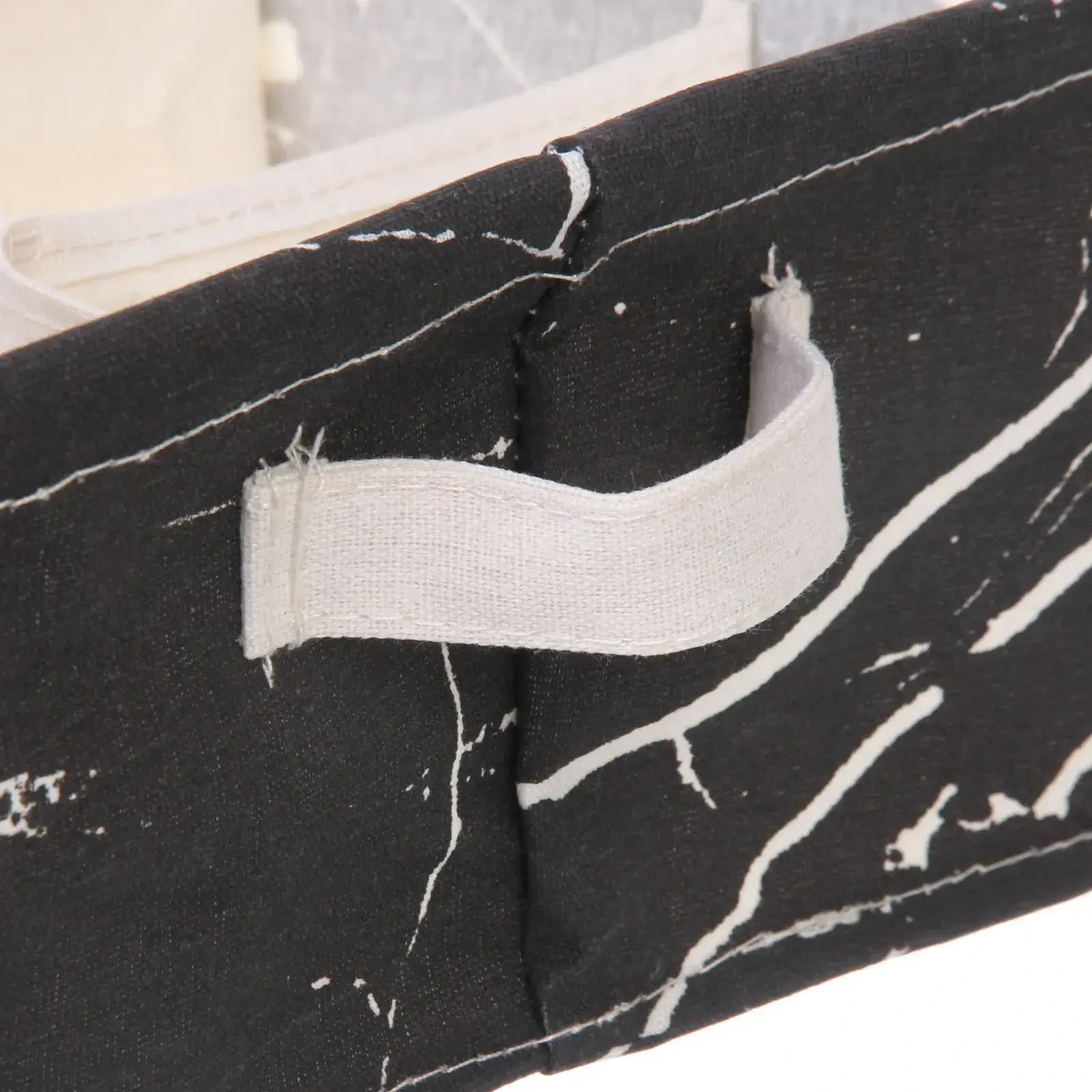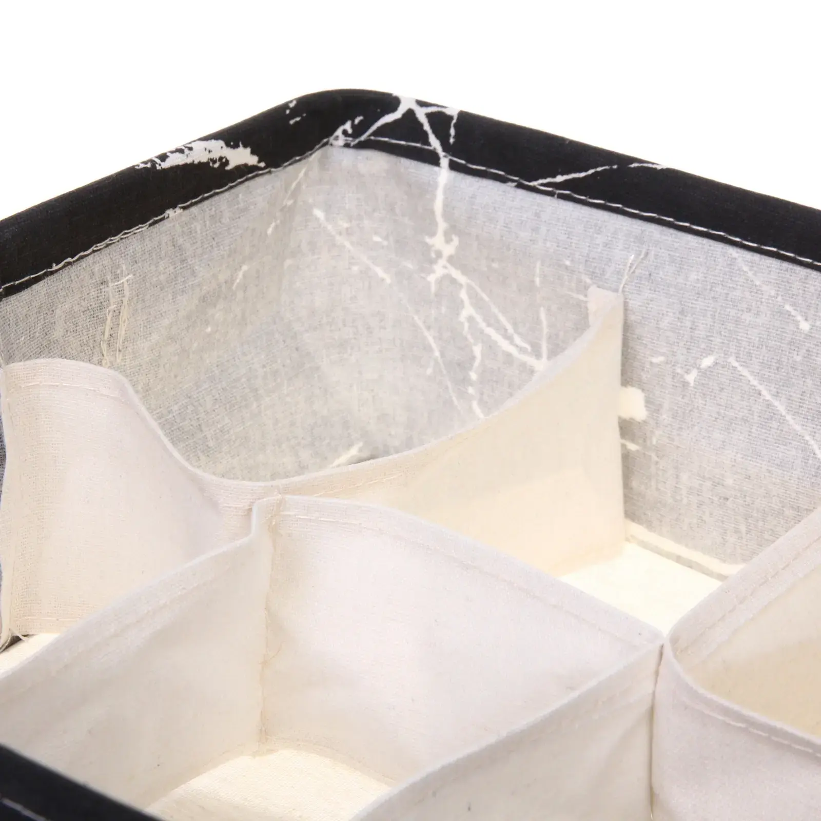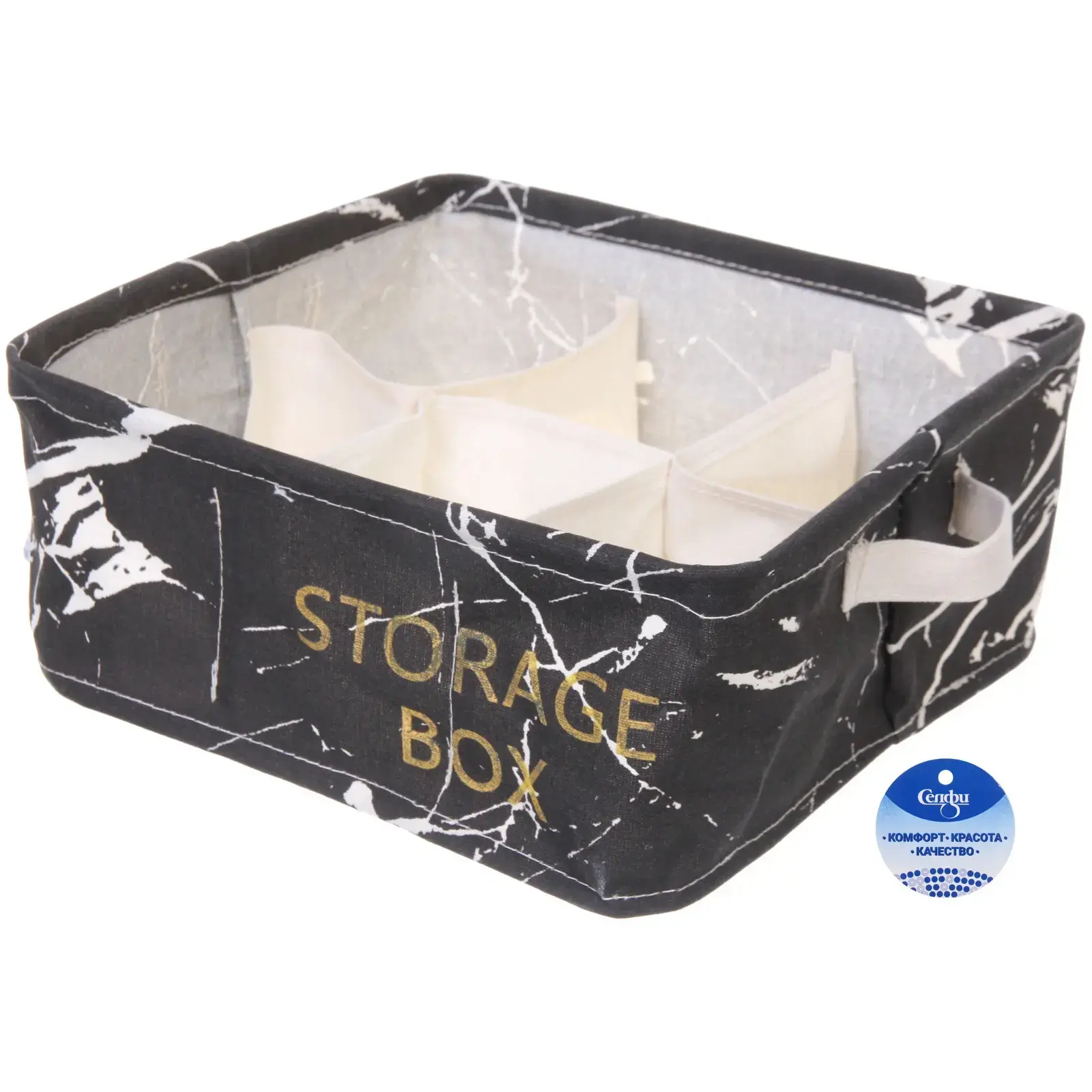 Коробка выполнена из прочного полиэстера, что обеспечивает долговечность и надежность. Мраморный узор в черном цвете придаёт ей стильный вид, а светлые перегородки внутри помогают организовать пространство. Вы сможете легко разделить вещи на категории, что сэкономит ваше время при поиске нужного предмета.