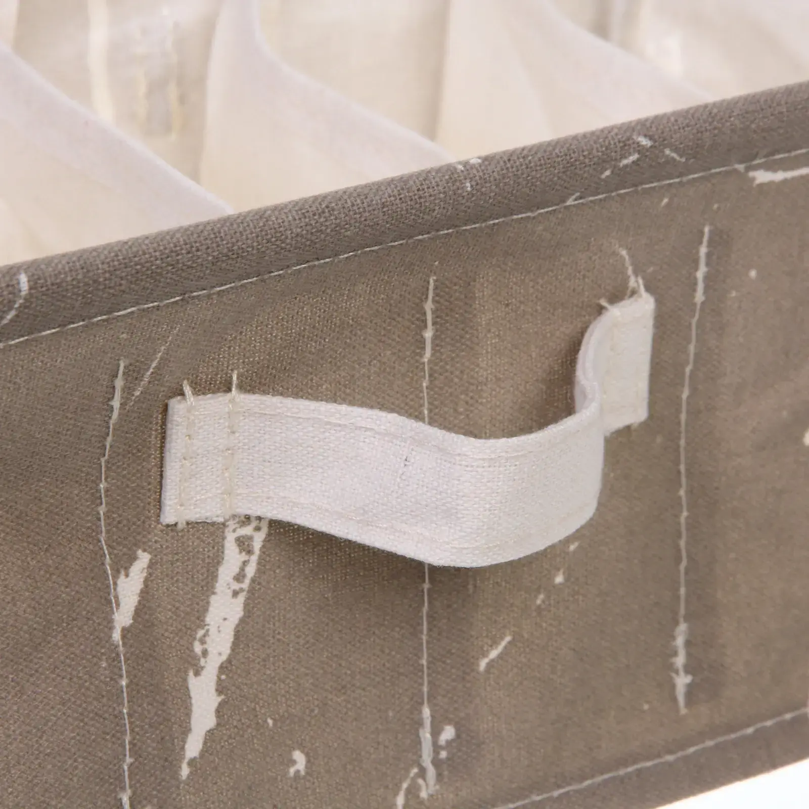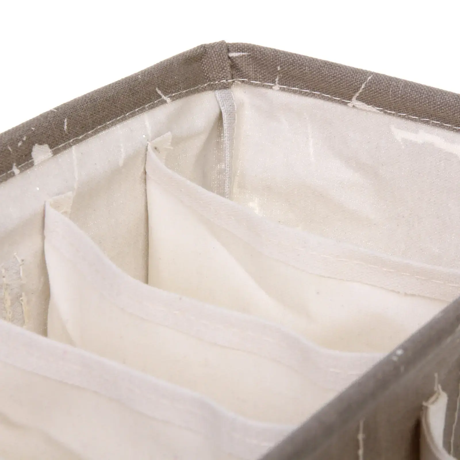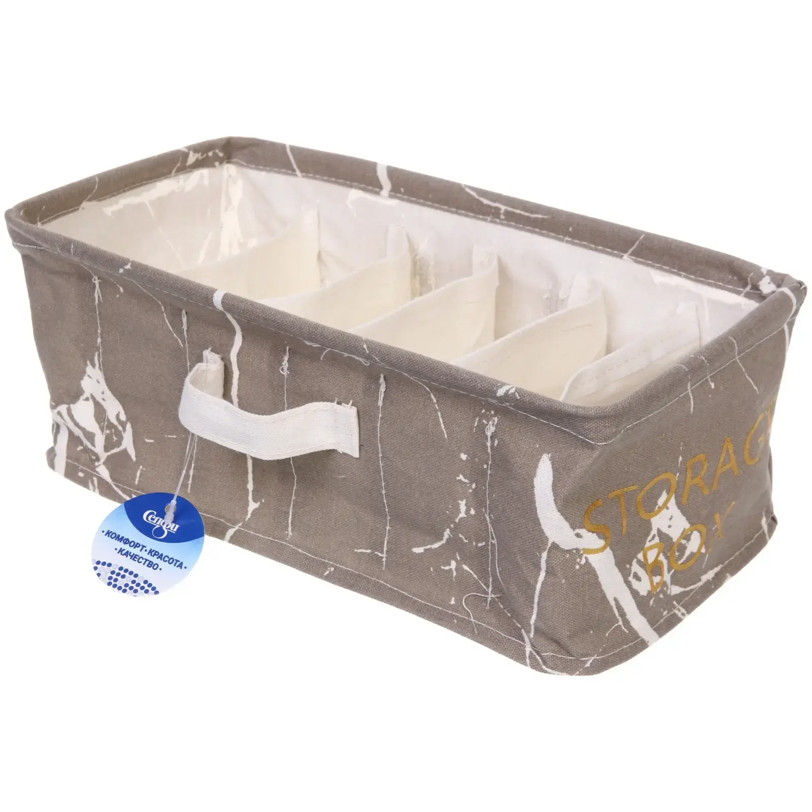 Коробка имеет размеры 32х17х12 см и выполнена из текстильного материала, что делает ее легкой и удобной в использовании. Серый цвет с белыми разводами добавляет нотку элегантности, а наличие перегородок позволяет организовать пространство по вашему усмотрению. Эта коробка станет незаменимым помощником в вашем доме, помогая поддерживать порядок и стиль.