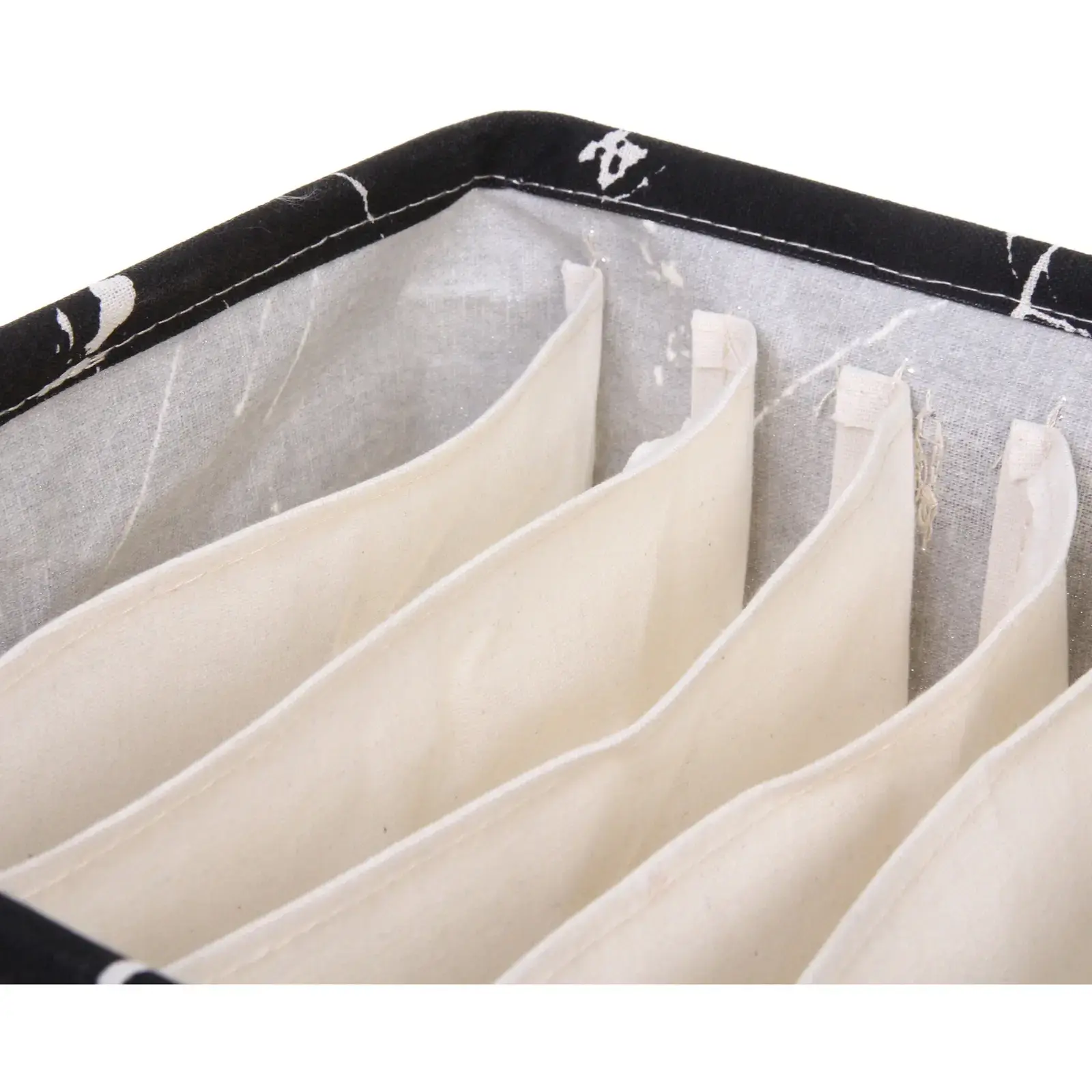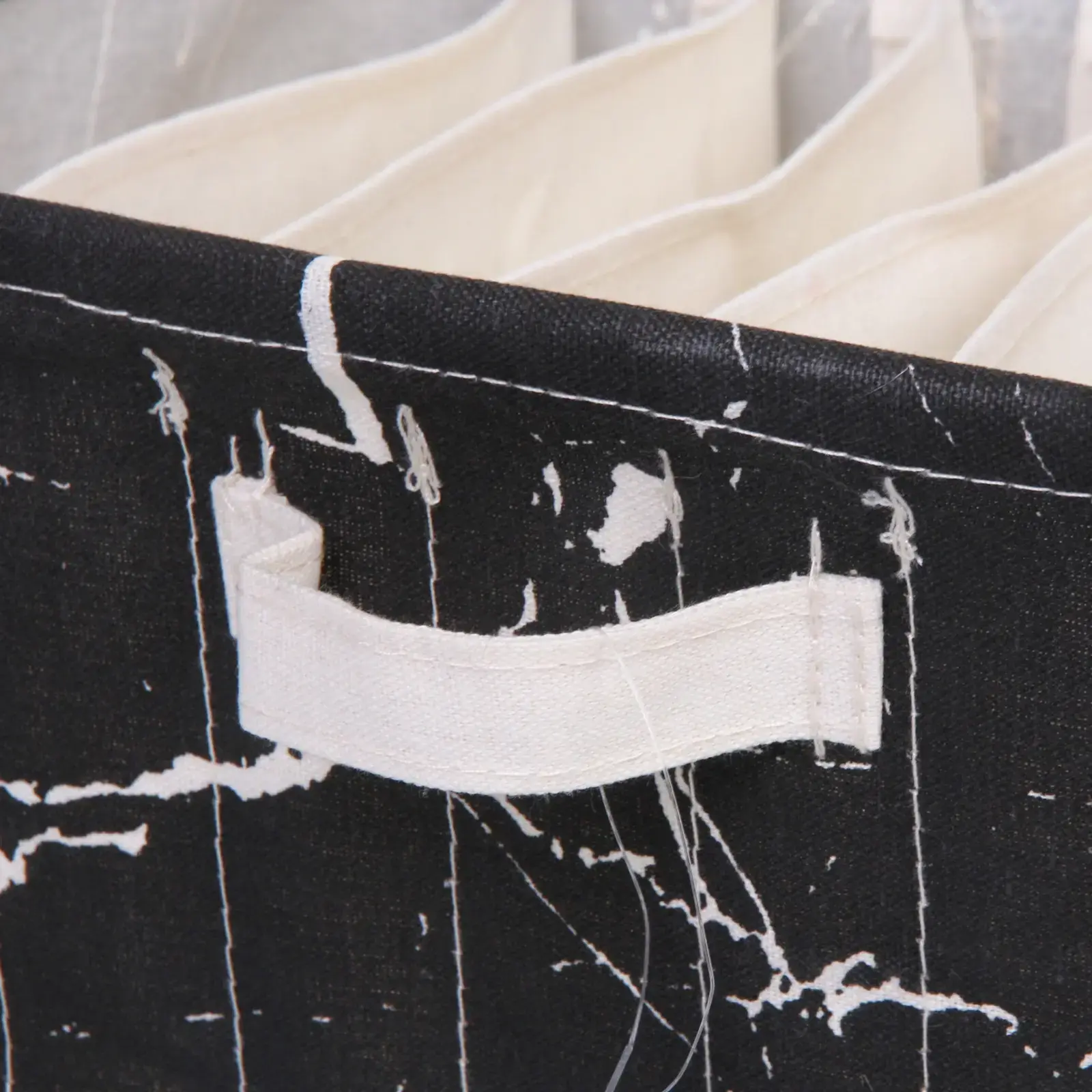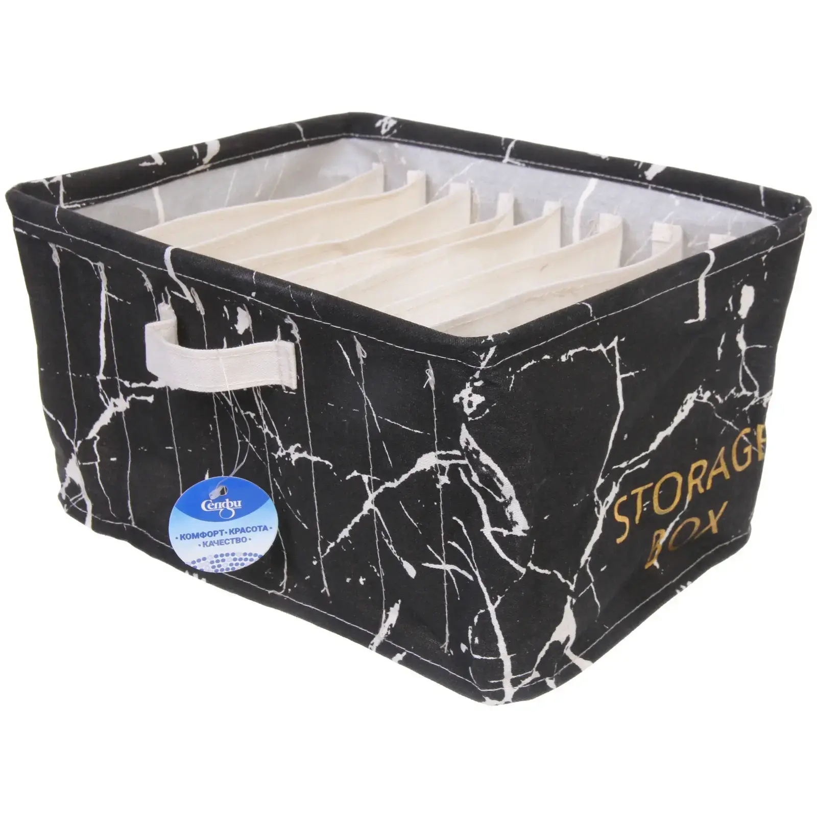 Коробка выполнена из прочного полиэстера, что обеспечивает её долговечность и надежность. Черный цвет с белыми мраморными узорами придаёт ей стильный вид, а светлая внутренняя подкладка делает её ещё более привлекательной. Две удобные ручки по бокам позволяют легко переносить коробку, а перегородки внутри помогают поддерживать порядок и организованность.