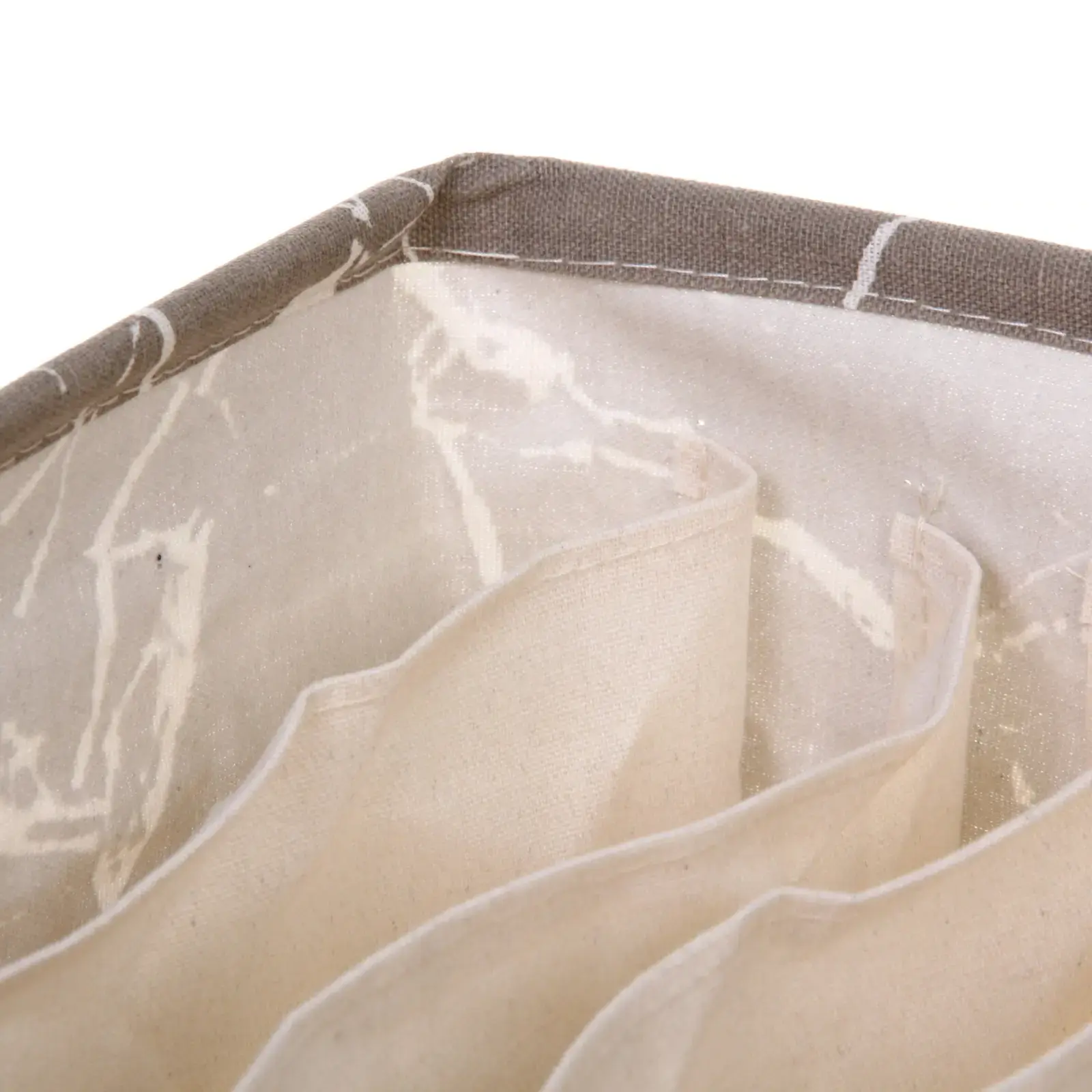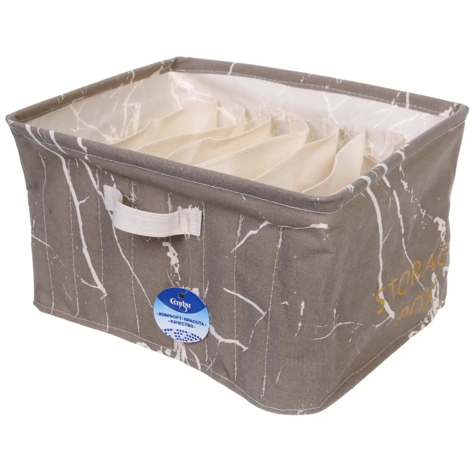 Коробка имеет прямоугольную форму и выполнена из текстильного материала, что делает её гибкой и лёгкой. Система разделителей внутри коробки выполнена в бежевом цвете, что добавляет эстетики и помогает в организации хранения. Не упустите возможность сделать ваш дом более уютным и организованным с помощью этой стильной коробки для хранения!