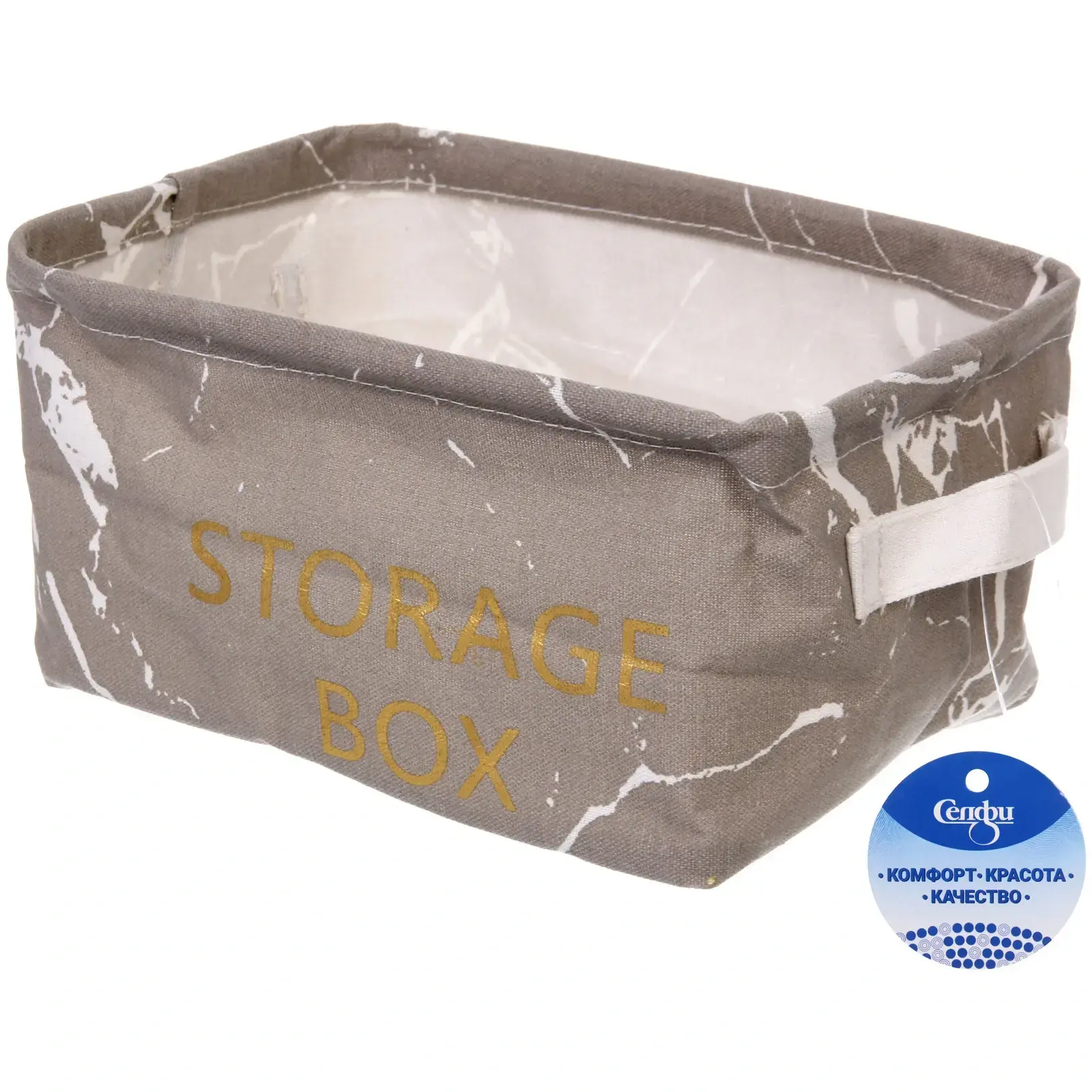 Коробка выполнена из прочного текстильного материала, который сохраняет форму даже при заполнении. Мягкие стенки обеспечивают защиту содержимого, а светлая внутренняя часть позволяет легко находить нужные вещи. Золотистая надпись «STORAGE BOX» добавляет стильный акцент, а логотип с текстом «КОМФОРТ-КРАСОТА-КАЧЕСТВО» подчеркивает высокое качество изделия.
