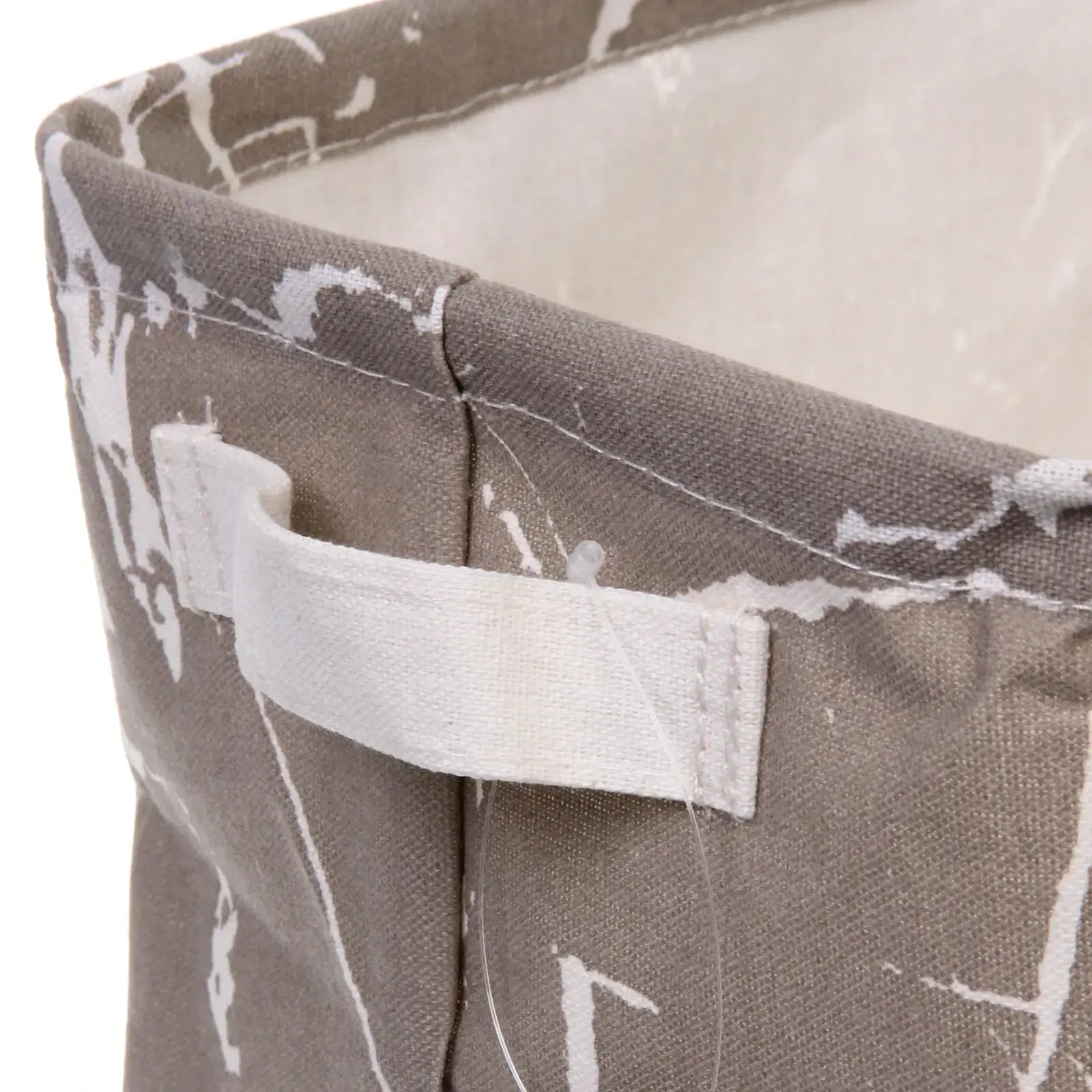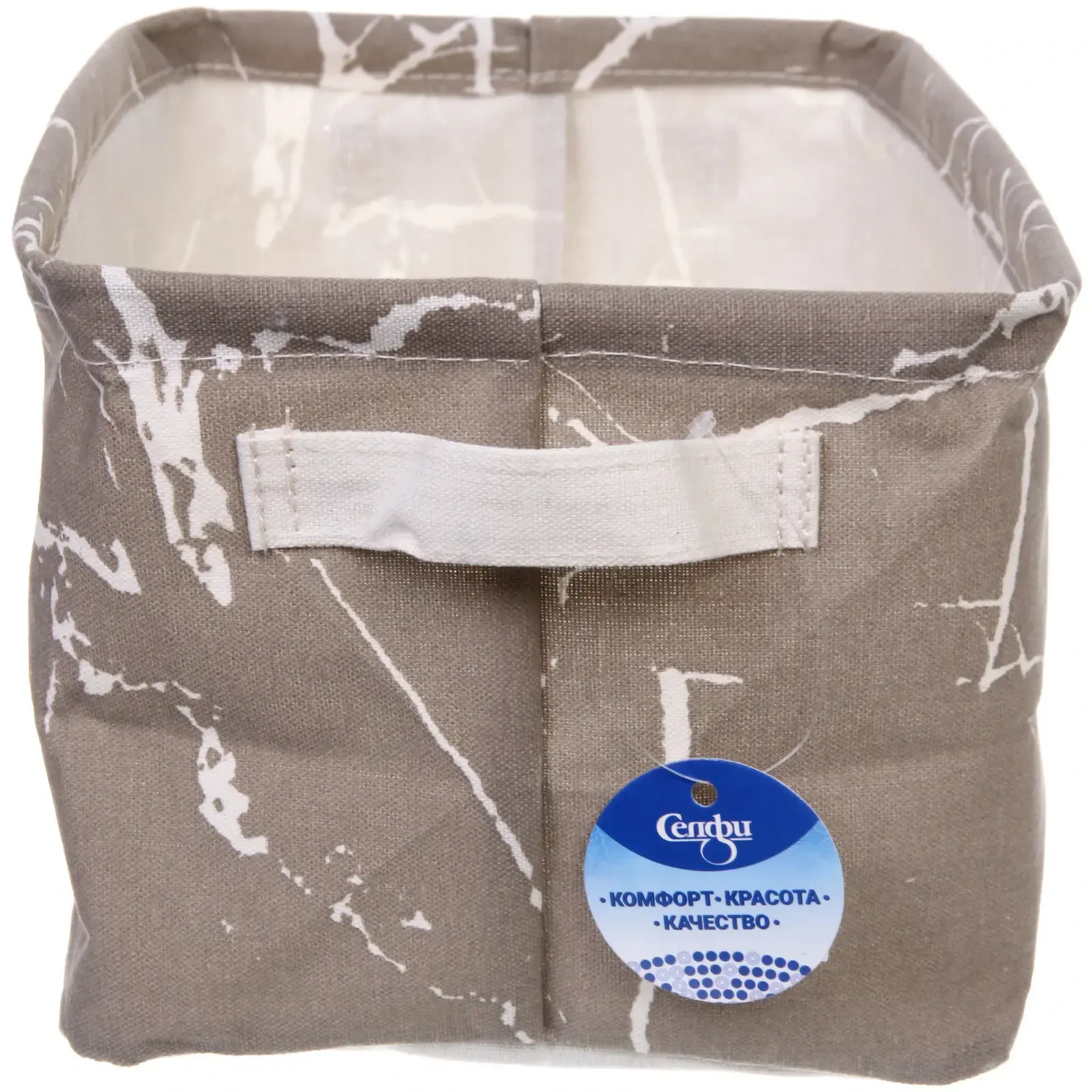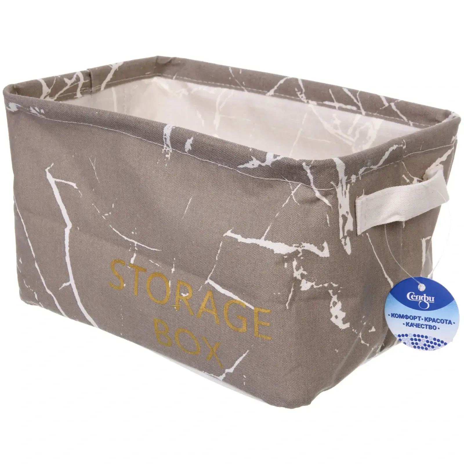 Коробка выполнена из прочного полиэстера, что гарантирует долговечность и надежность. Серый цвет с белым мраморным узором придает ей стильный вид, а светлая внутренняя часть позволяет легко находить нужные вещи. Она устойчива к загрязнениям и легко чистится, что делает ее идеальным выбором для активного использования.