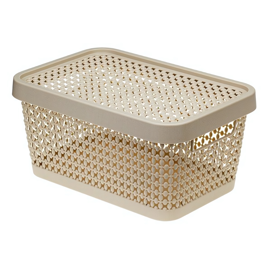 Коробка для хранения «Пирула» объёмом 4,5 л помогает поддерживать порядок без лишних усилий. Элегантное жемчужное плетение делает её не просто практичной, а гармоничной деталью интерьера. Сквозной узор позволяет легко увидеть содержимое, экономя ваше время при поиске нужных мелочей.