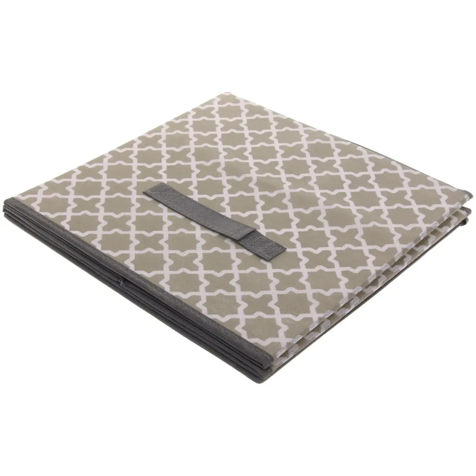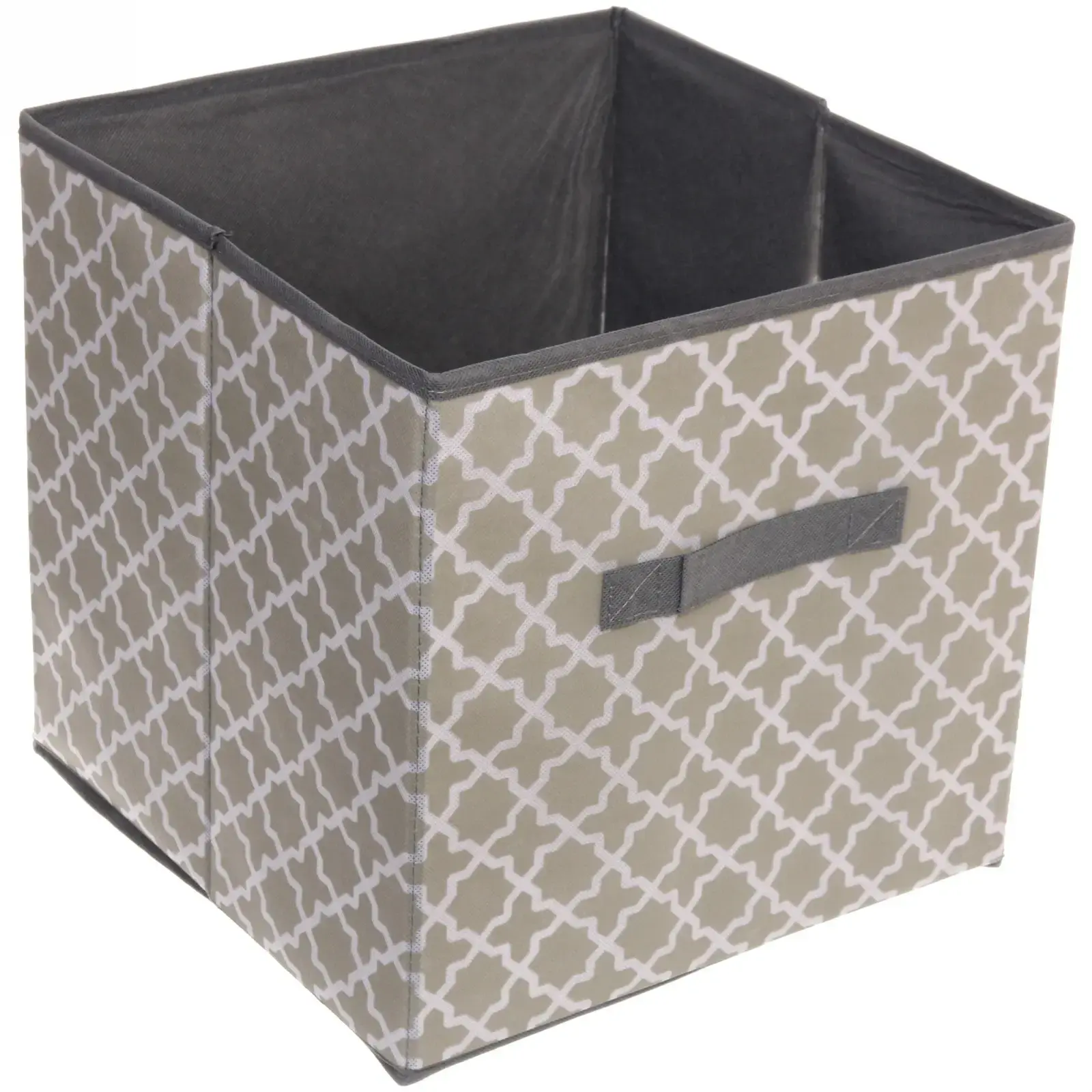 Квадратная форма 31×31×31 см оптимальна для размещения стандартных полок. Внутреннее пространство без карманов позволяет свободно компоновать содержимое. Серый узор на бежевом фоне сочетается с большинством цветовых схем.