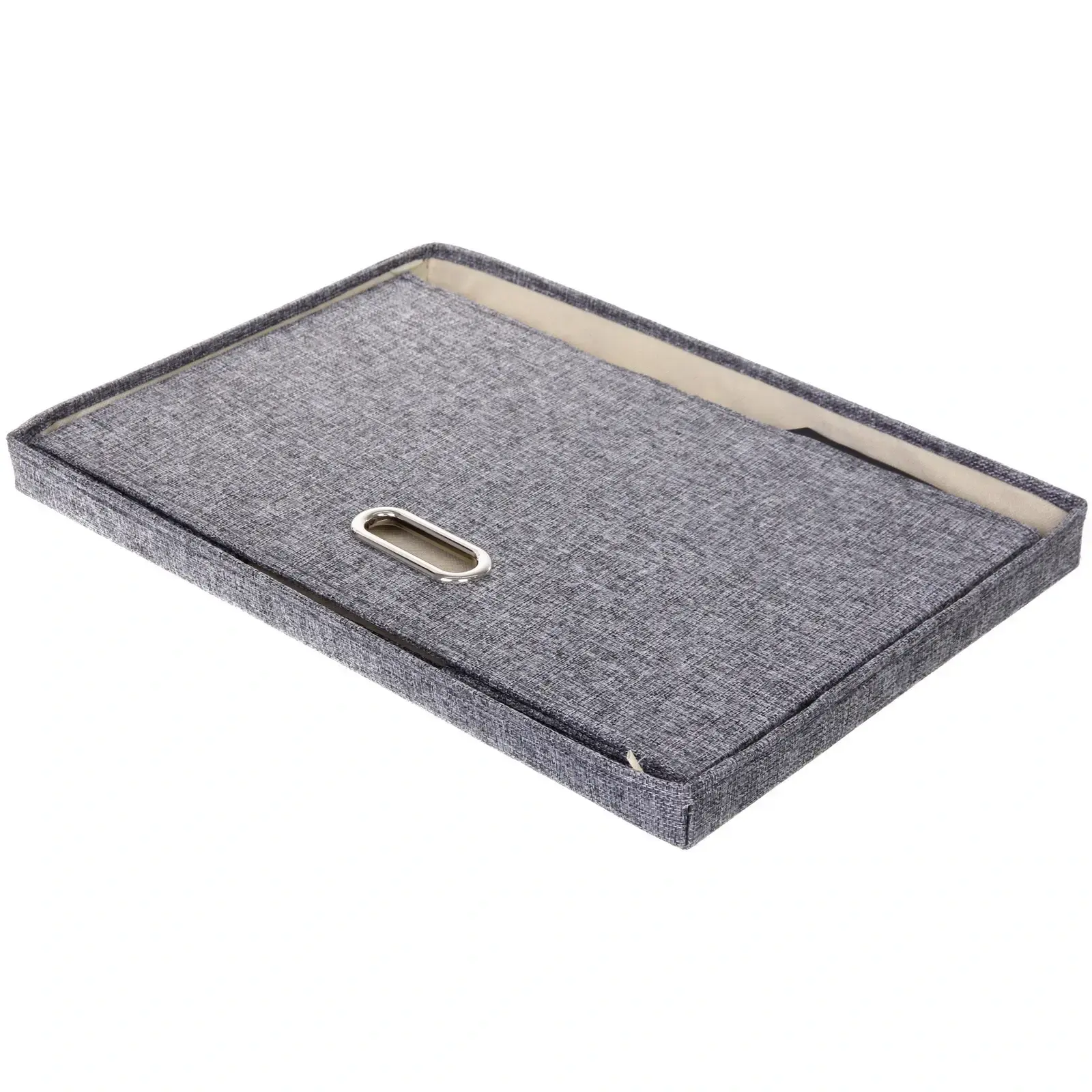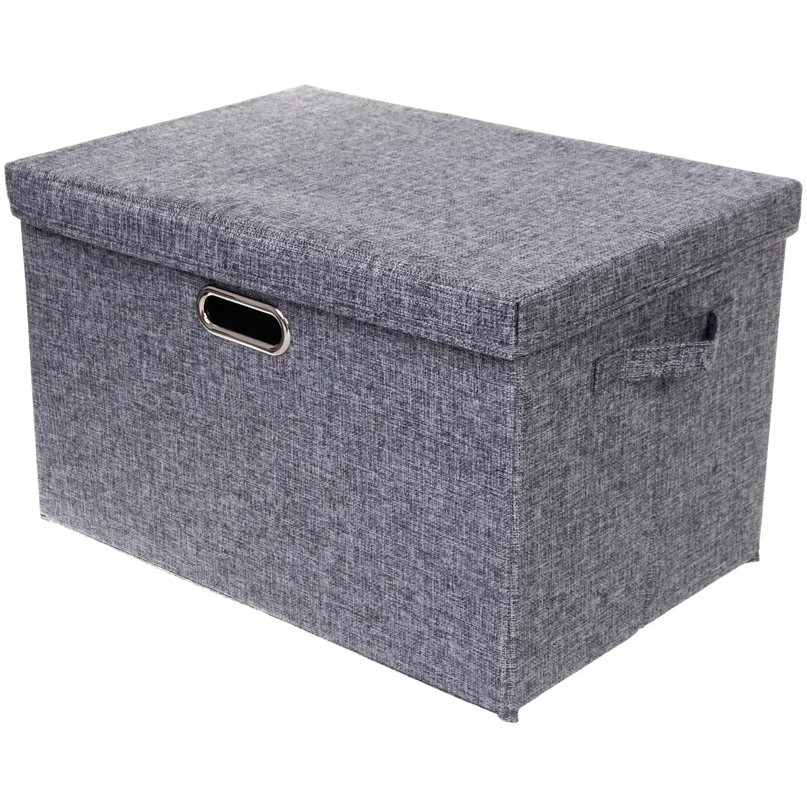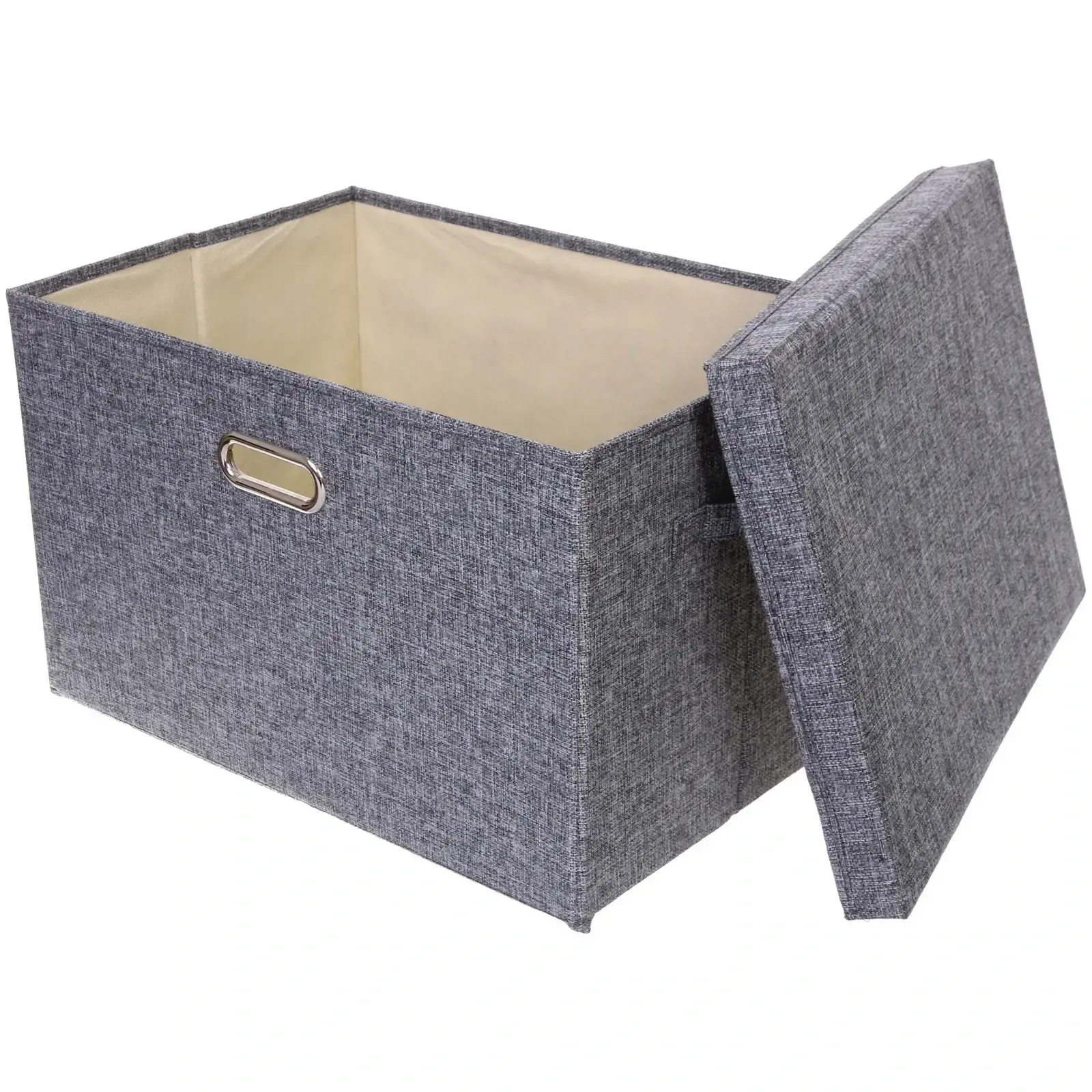Коробка имеет прямоугольную форму и выполнена в сером цвете с текстурой, напоминающей лен. Внутренняя часть коробки отделана светлым материалом, что добавляет ей изысканности. Металлические ручки овальной формы обеспечивают удобство при открывании и переноске. Эта коробка станет отличным решением для организации хранения в любом помещении.