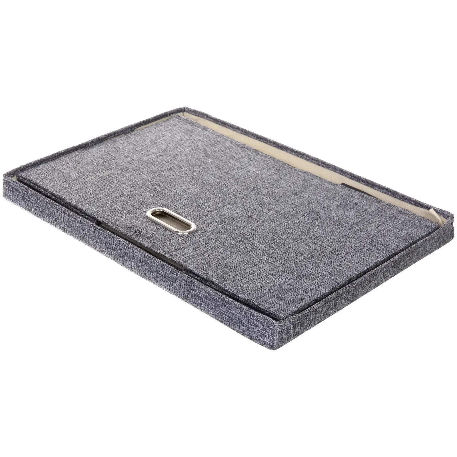 Коробка имеет прямоугольную форму и выполнена в сером цвете с текстурированной поверхностью. Внутренняя часть коробки выполнена из светлого материала, что добавляет ей легкости и свежести. Металлические ручки обеспечивают удобство при открывании и переноске. Эта коробка станет отличным решением для организации хранения в вашем доме.