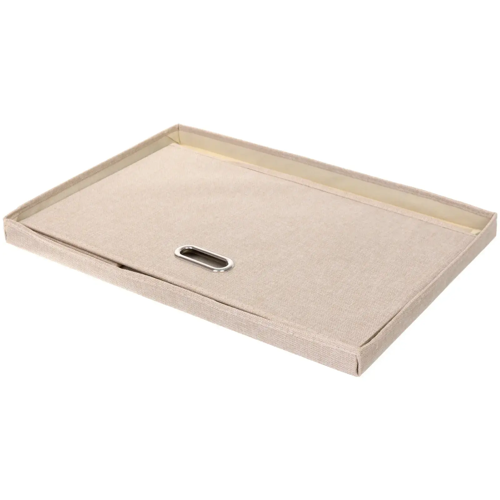 Коробка имеет прямоугольную форму и выполнена в светло-бежевом цвете, что делает ее универсальной для любого стиля. Размеры 58х40х35 см позволяют использовать ее в различных помещениях: от детской комнаты до гостиной. Складная конструкция и ручки для переноски делают ее удобной в использовании.